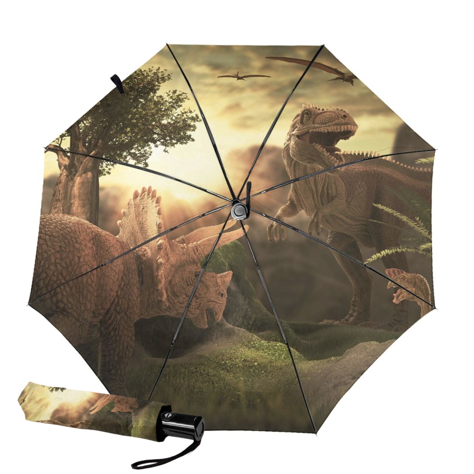 - Dieser bedruckte, faltbare Regenschirm ist auf der Innenseite des Schirmdachs mit einem klassischen Dinosaurier-Designmuster aus der Jurazeit bedruckt.