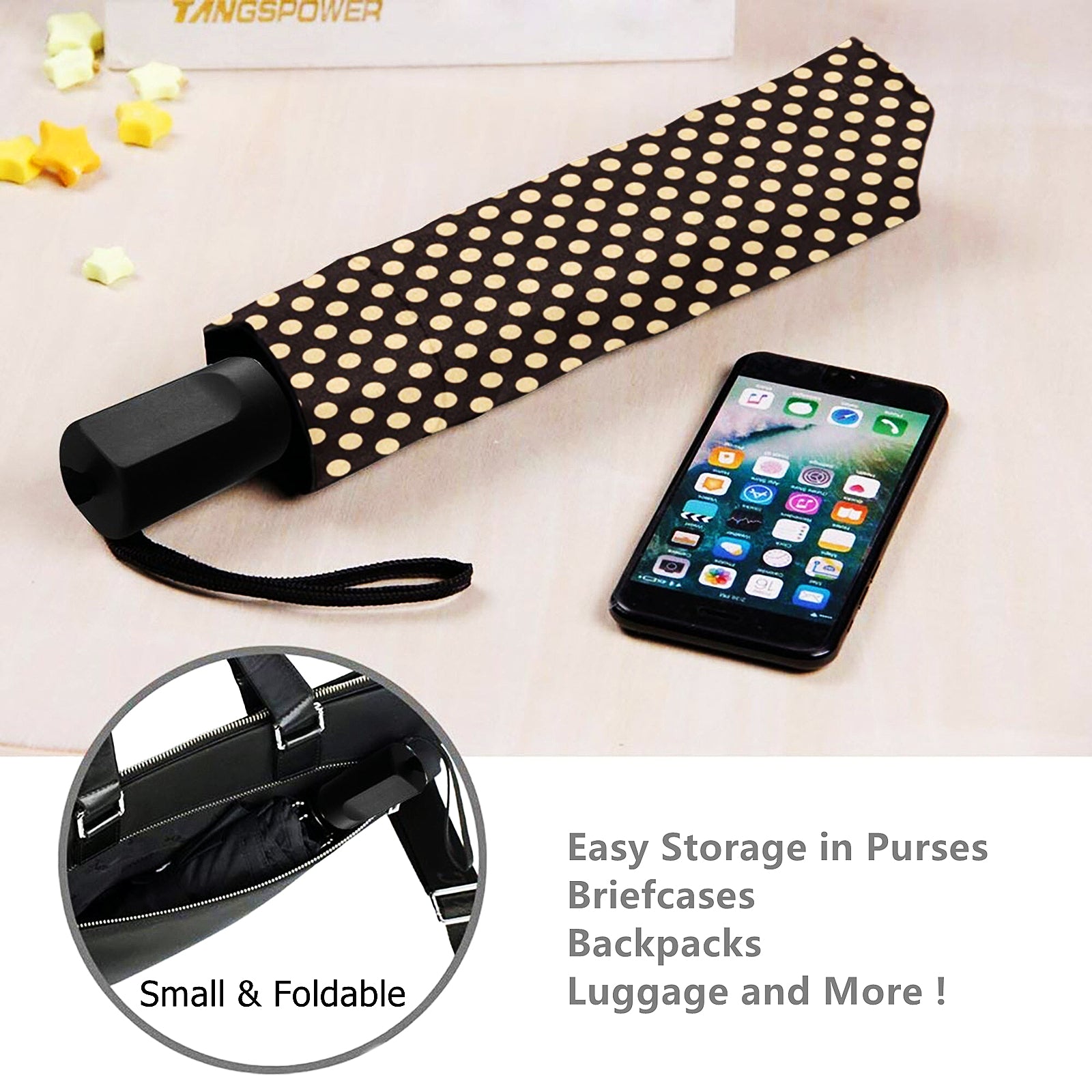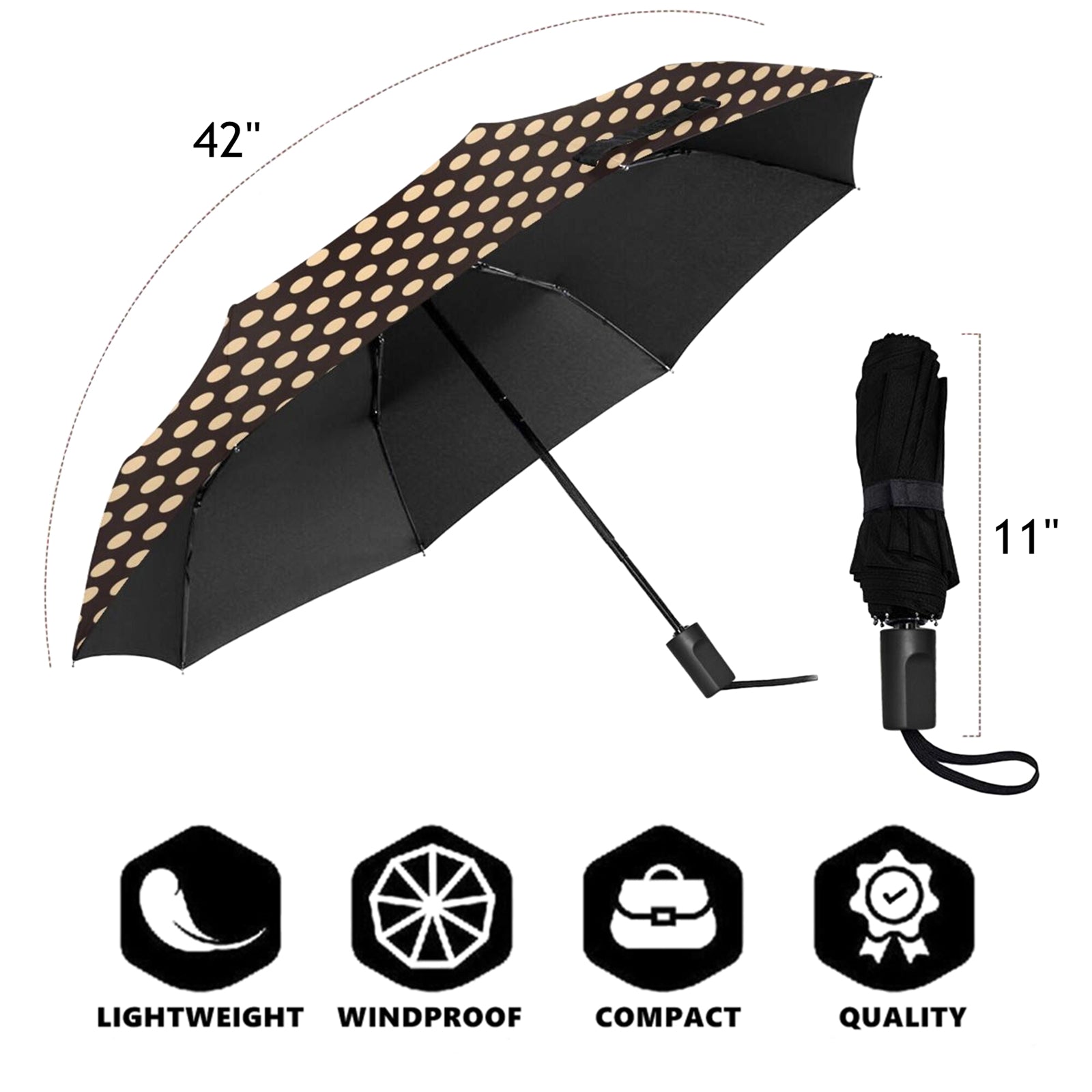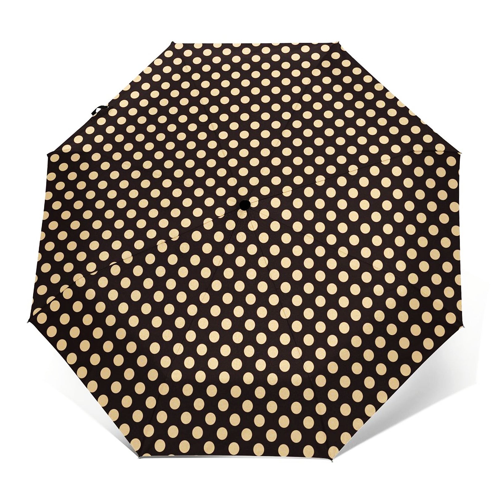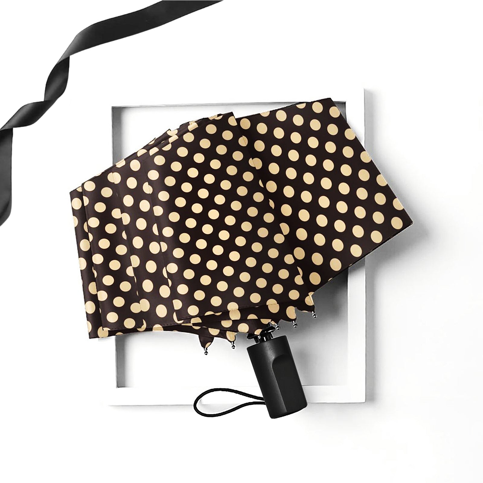 - Dieser manuell faltbare Regenschirm ist auf der Außenseite des Schirms mit einem klassischen beigen Tupfenmuster bedruckt.