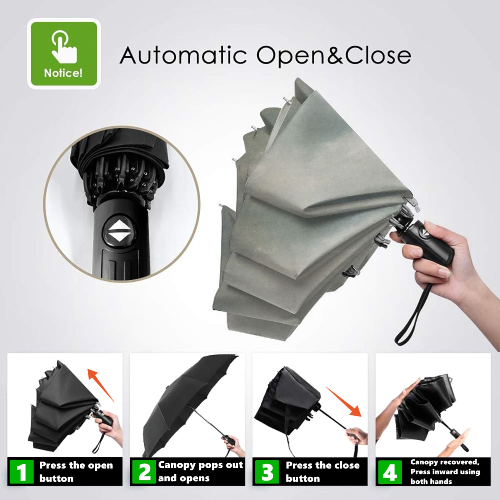 - Dies ist ein superhochwertiger und multifunktionaler Taschenschirm mit automatischem Öffnen und Schließen, der sich sowohl für den Einsatz an sonnigen als auch an regnerischen Tagen eignet.