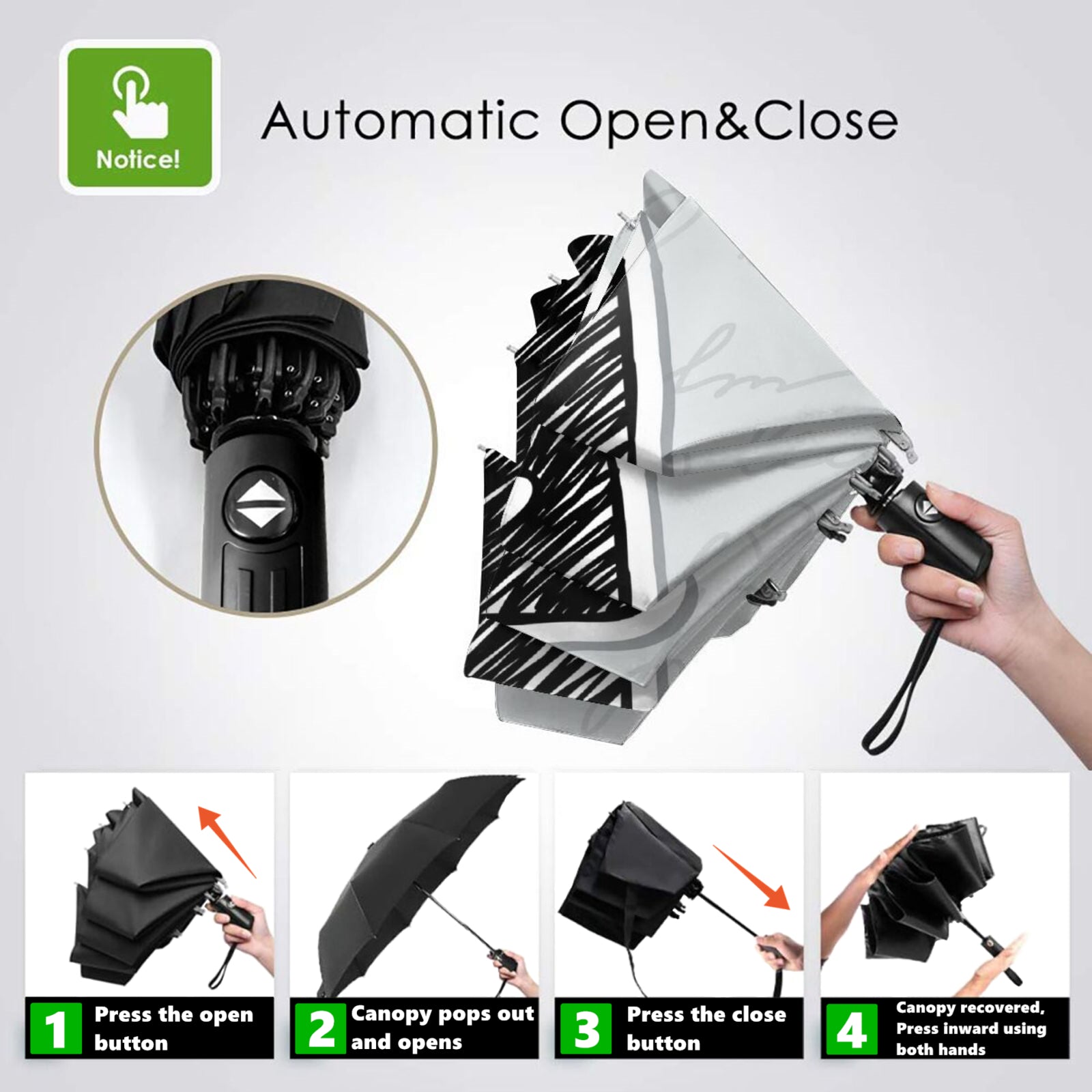- Dies ist ein superhochwertiger und multifunktionaler Taschenschirm mit automatischem Öffnen und Schließen, der sich sowohl für den Einsatz an sonnigen als auch an regnerischen Tagen eignet.