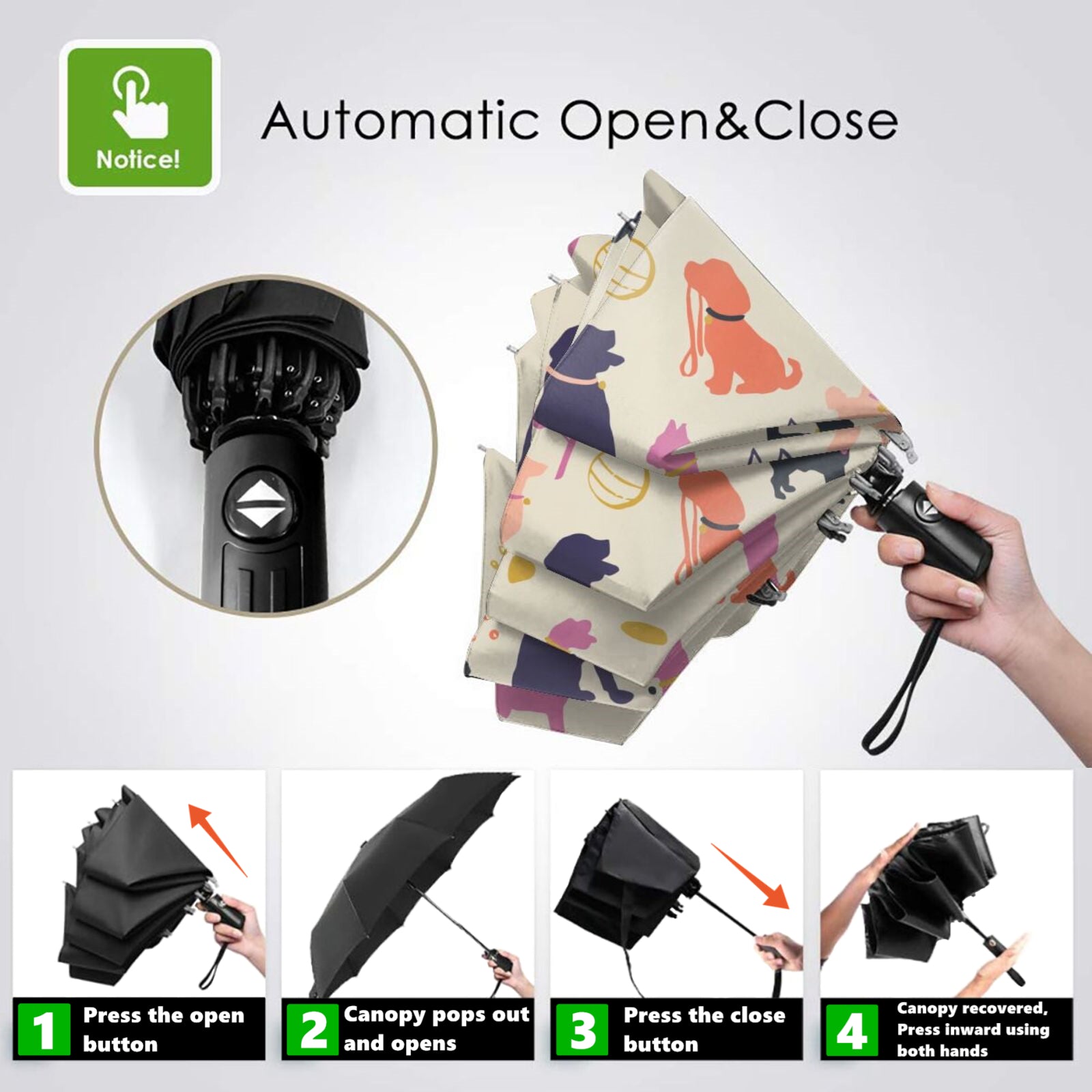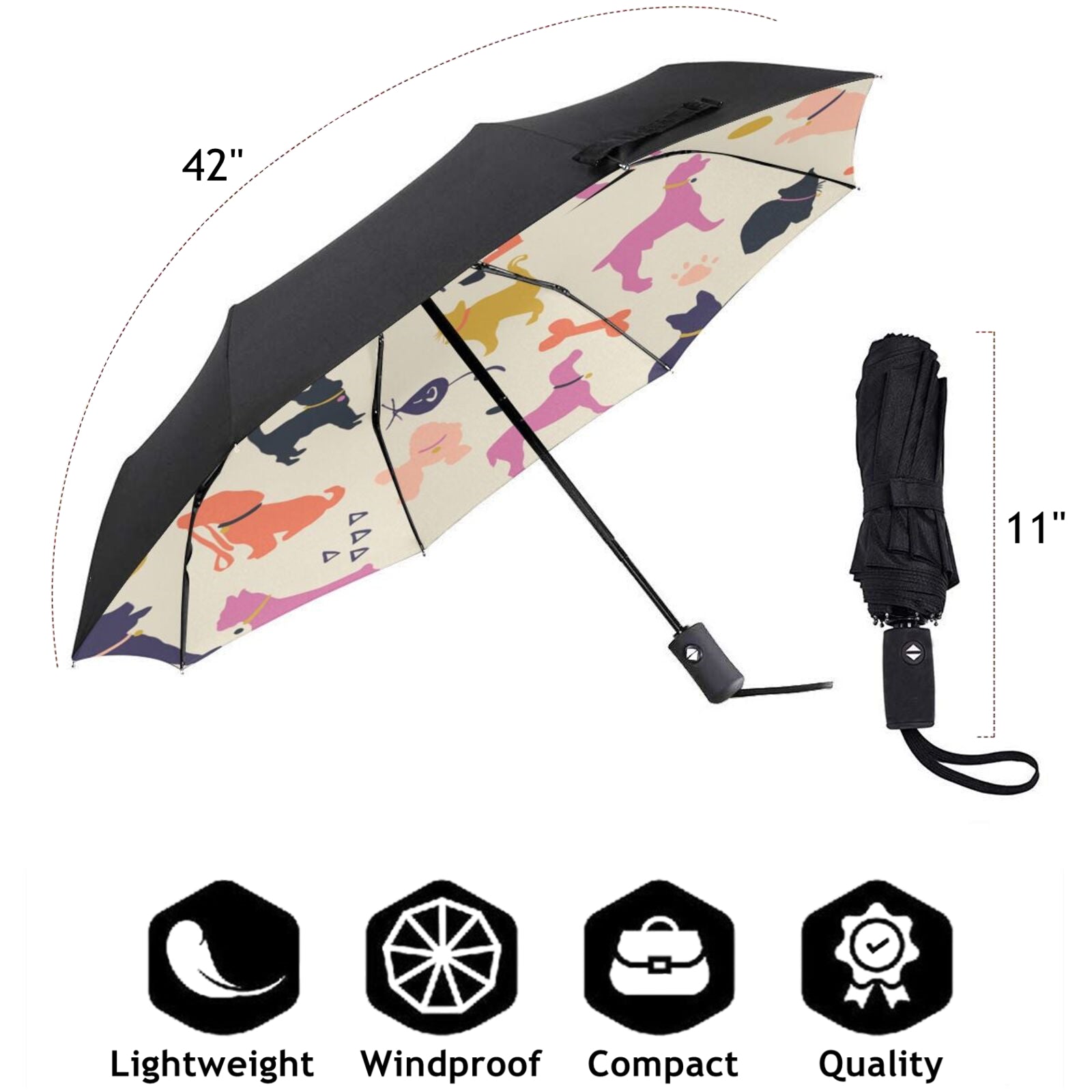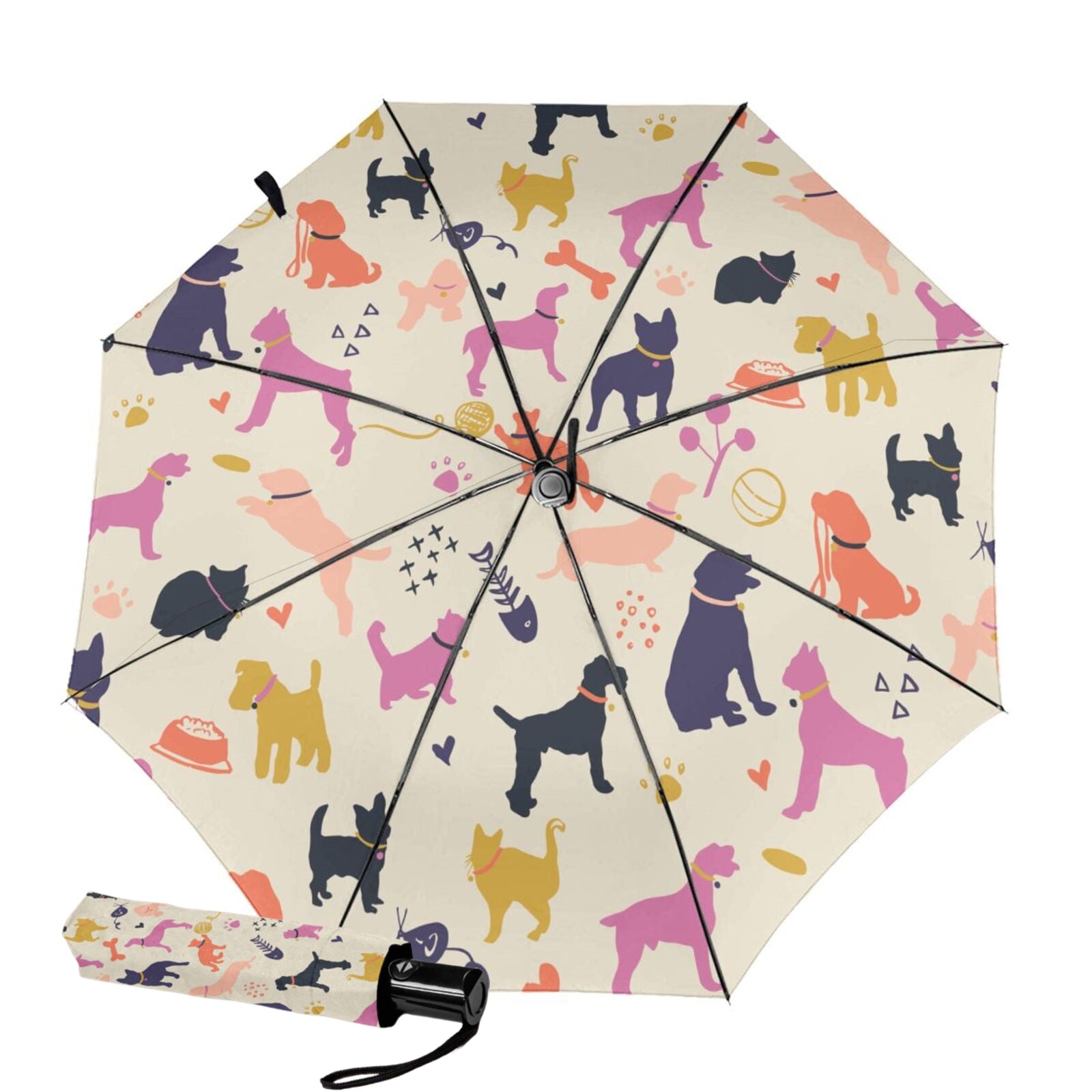 - Dieser bedruckte faltbare Regenschirm ist auf der Innenseite des Schirmdachs mit einem klassischen Hunde- und Katzenmuster bedruckt.