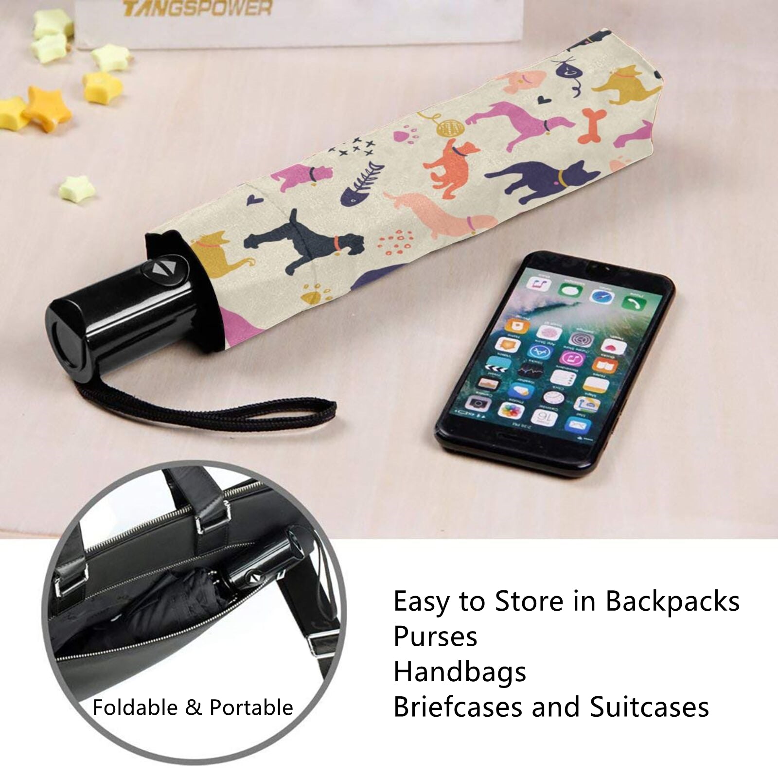 Kompakter Regenschirm mit Hunde- und Katzenmotiv im Inneren