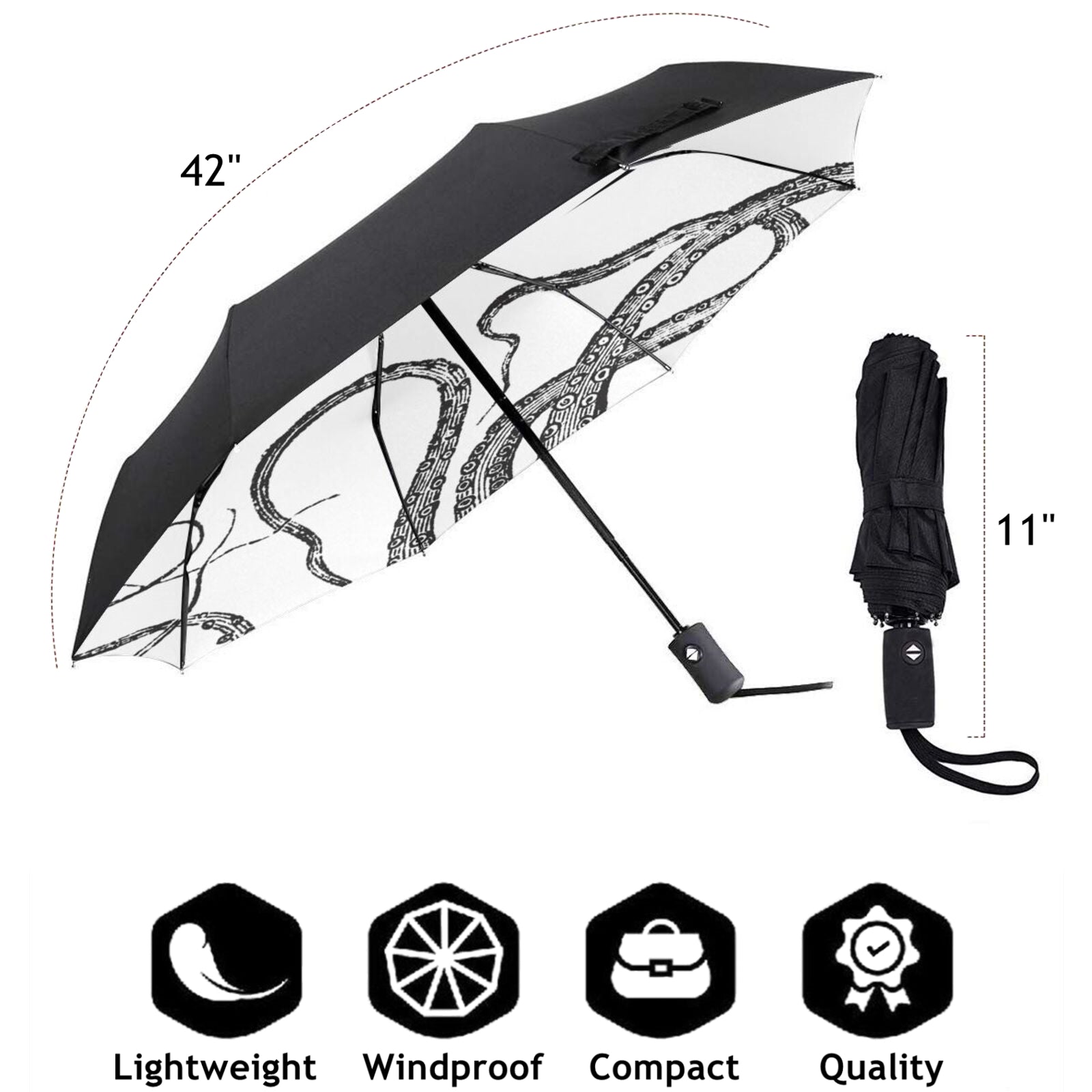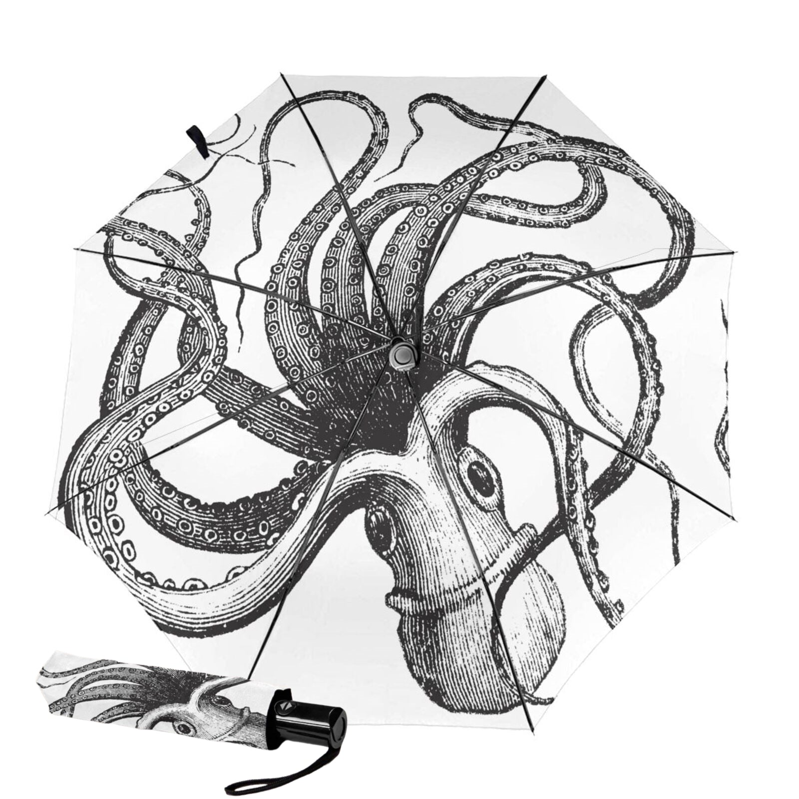 - Dieser bedruckte, faltbare Regenschirm ist auf der Innenseite des Schirmdachs mit einem wunderschönen Oktopus-Muster bedruckt.