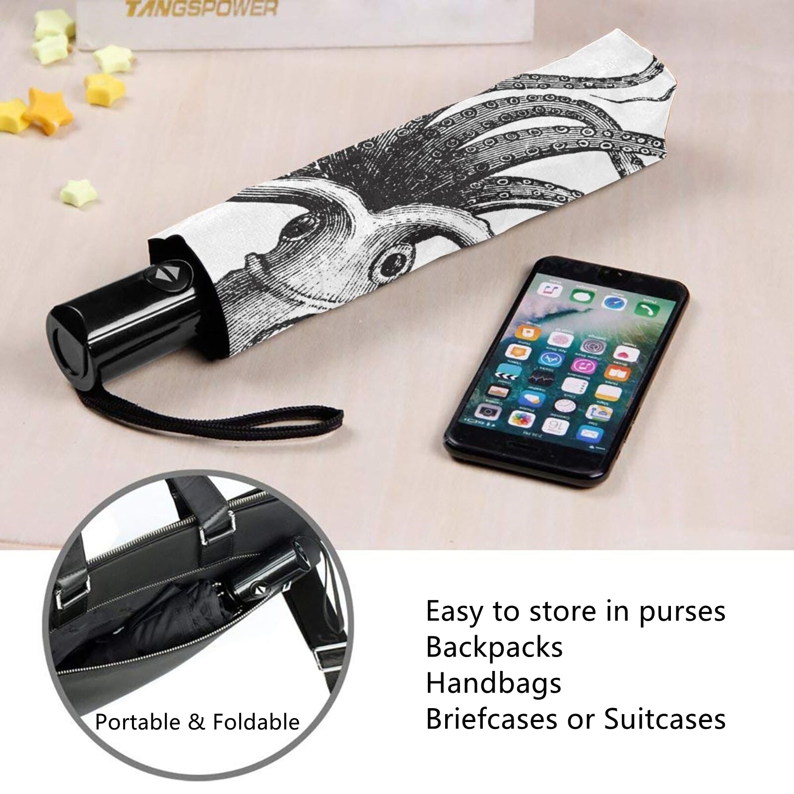 Kompakter Regenschirm mit Oktopus-Design im Inneren