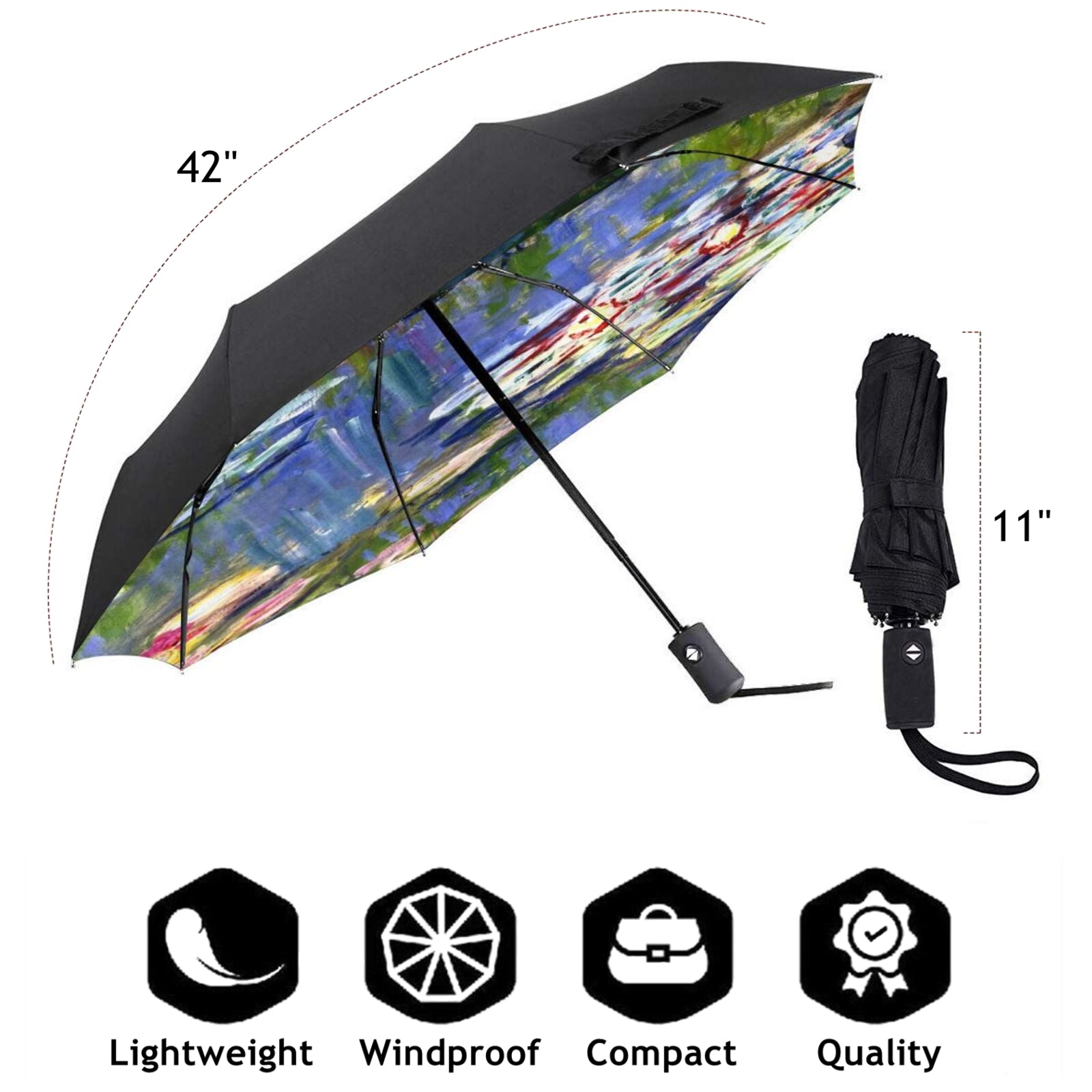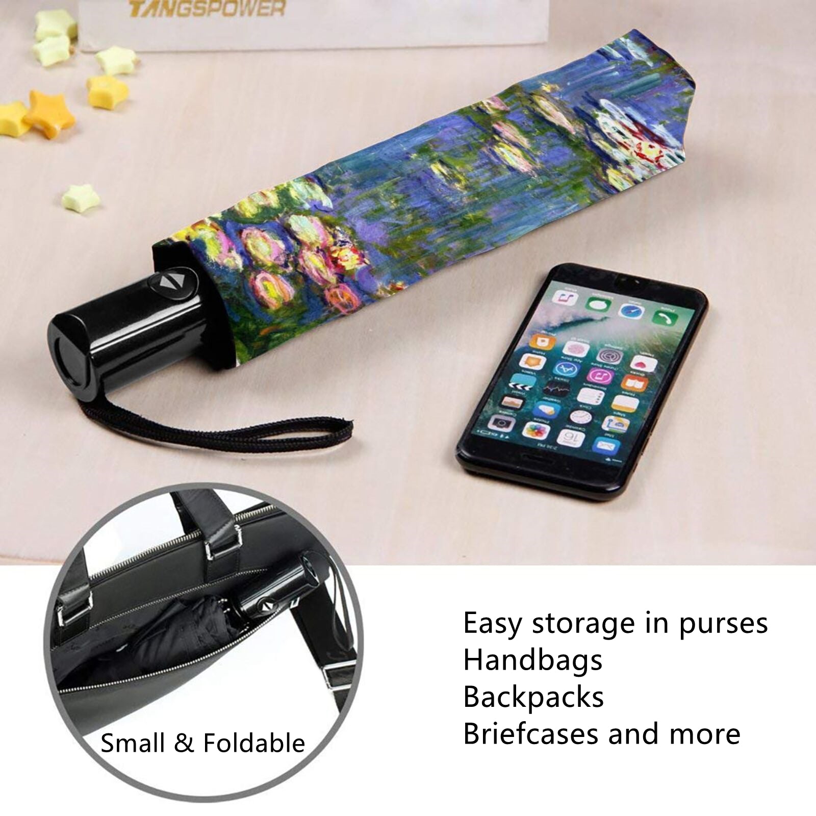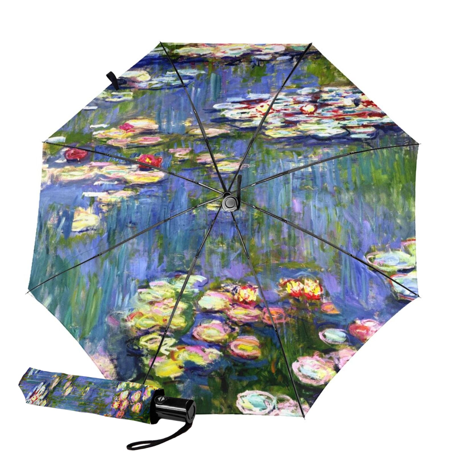 - Dieser bedruckte, faltbare Regenschirm ist auf der Innenseite des Schirmdachs mit einem klassischen Ölgemälde-Designmuster mit Seerosen bedruckt.