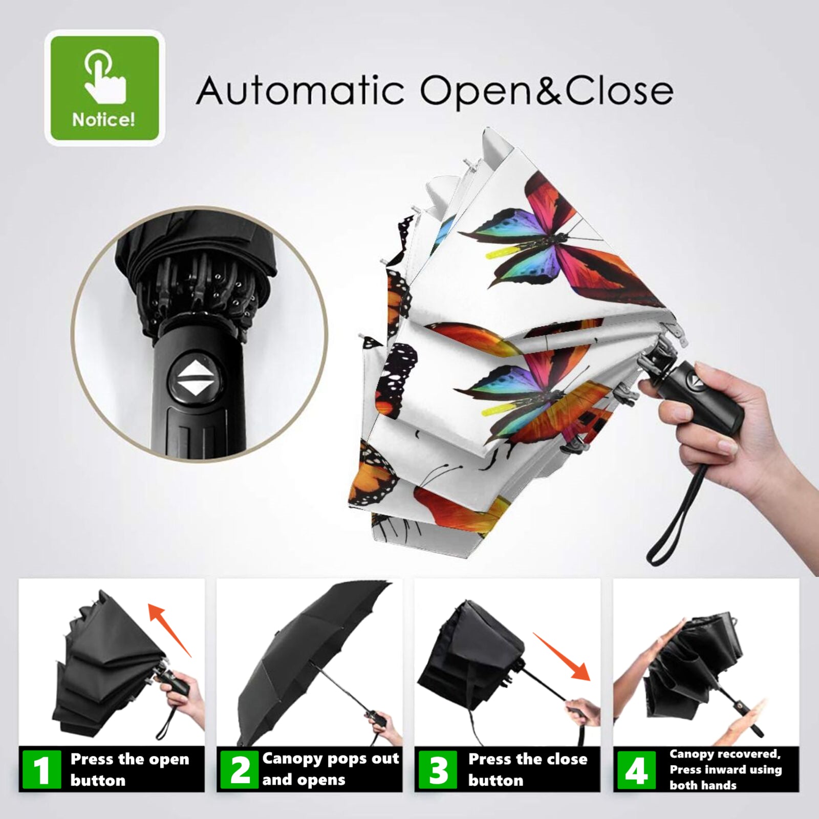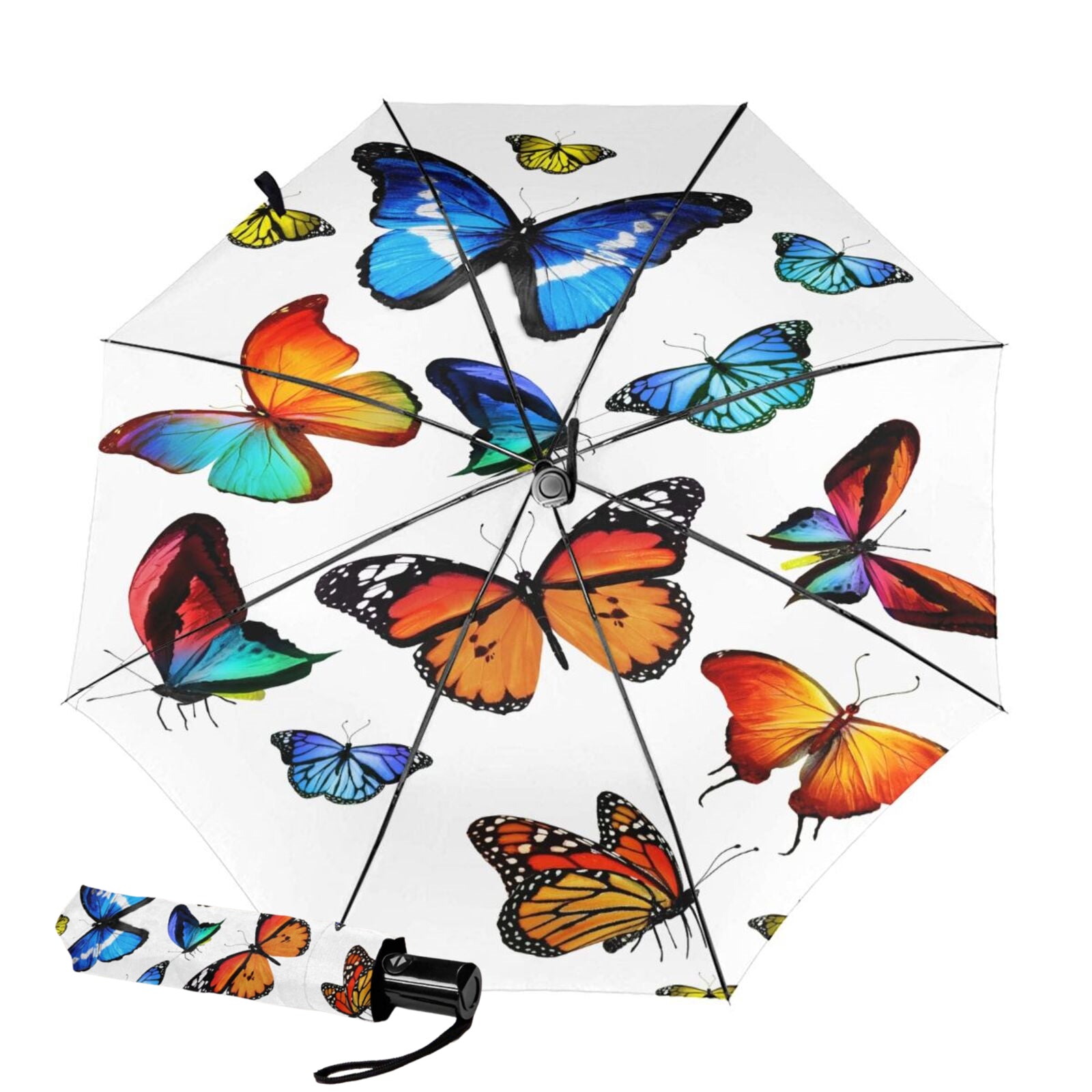 - Dieser bedruckte, faltbare Regenschirm ist auf der Innenseite des Schirmdachs mit einem klassischen Schmetterlingsmuster bedruckt.