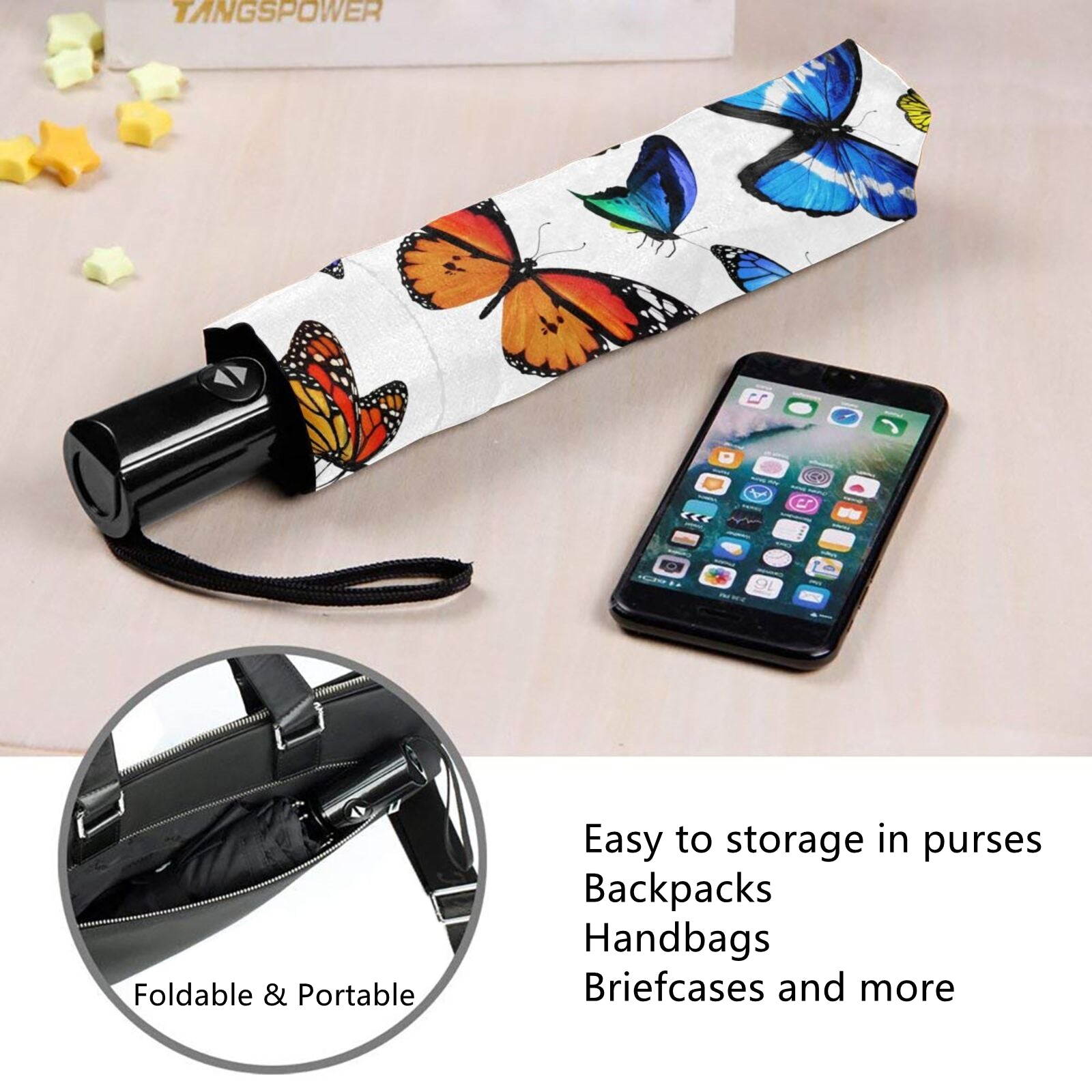 - Die gesamte Aufbewahrungslänge beträgt im zusammengeklappten Zustand des Schirms nur 11 Zoll und das Nettogewicht beträgt nur 350 Gramm. Er passt problemlos in Ihre Handtasche, Ihren Rucksack, Ihre Aktentasche oder die Aufbewahrungsbox im Auto usw.