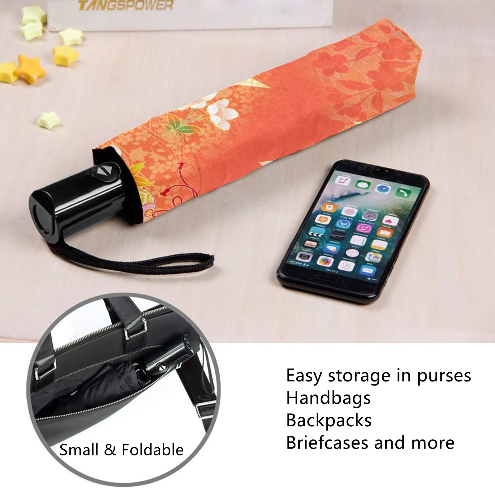 - Die gesamte Aufbewahrungslänge beträgt im zusammengeklappten Zustand des Schirms nur 11 Zoll und das Nettogewicht beträgt nur 350 Gramm. Er passt problemlos in Ihre Handtasche, Ihren Rucksack, Ihre Aktentasche oder die Aufbewahrungsbox im Auto usw.