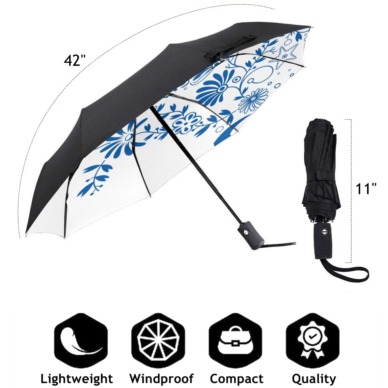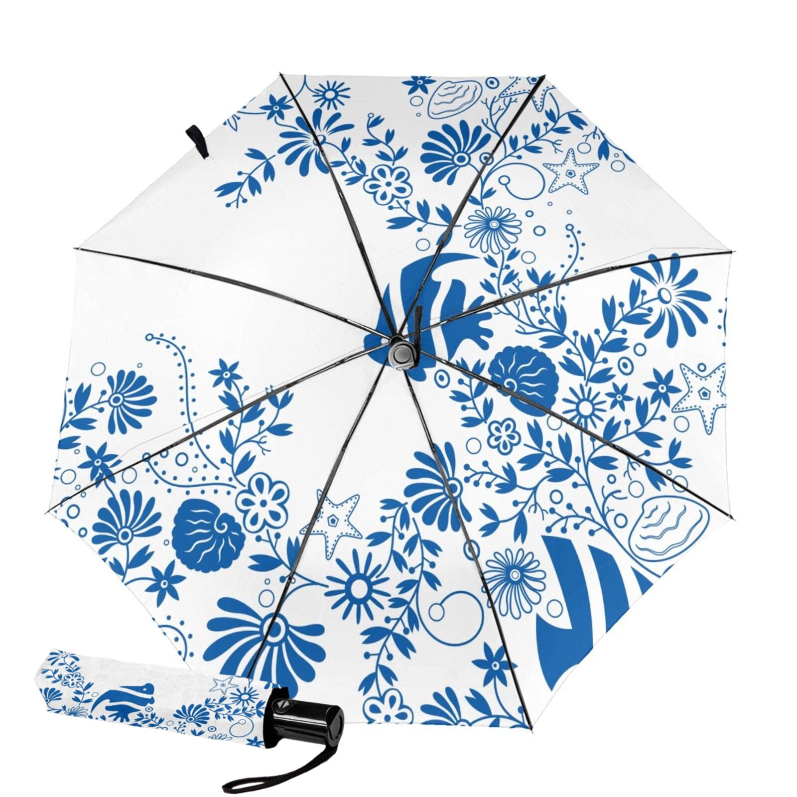 - Dieser bedruckte, faltbare Regenschirm ist auf der Innenseite des Schirmdachs mit einem klassischen Fisch- und Seetangmuster bedruckt.