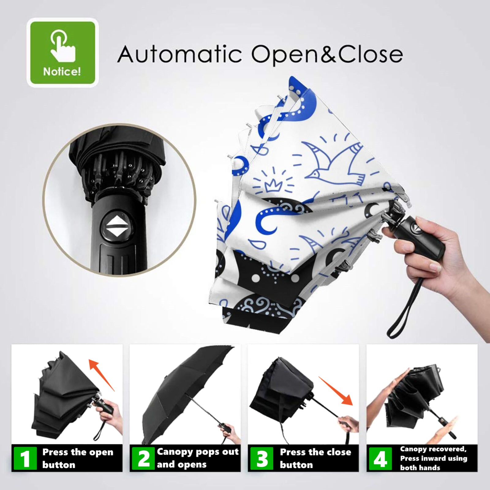 - Dies ist ein superhochwertiger und multifunktionaler Taschenschirm mit automatischem Öffnen und Schließen, der sich sowohl für den Einsatz an sonnigen als auch an regnerischen Tagen eignet.
