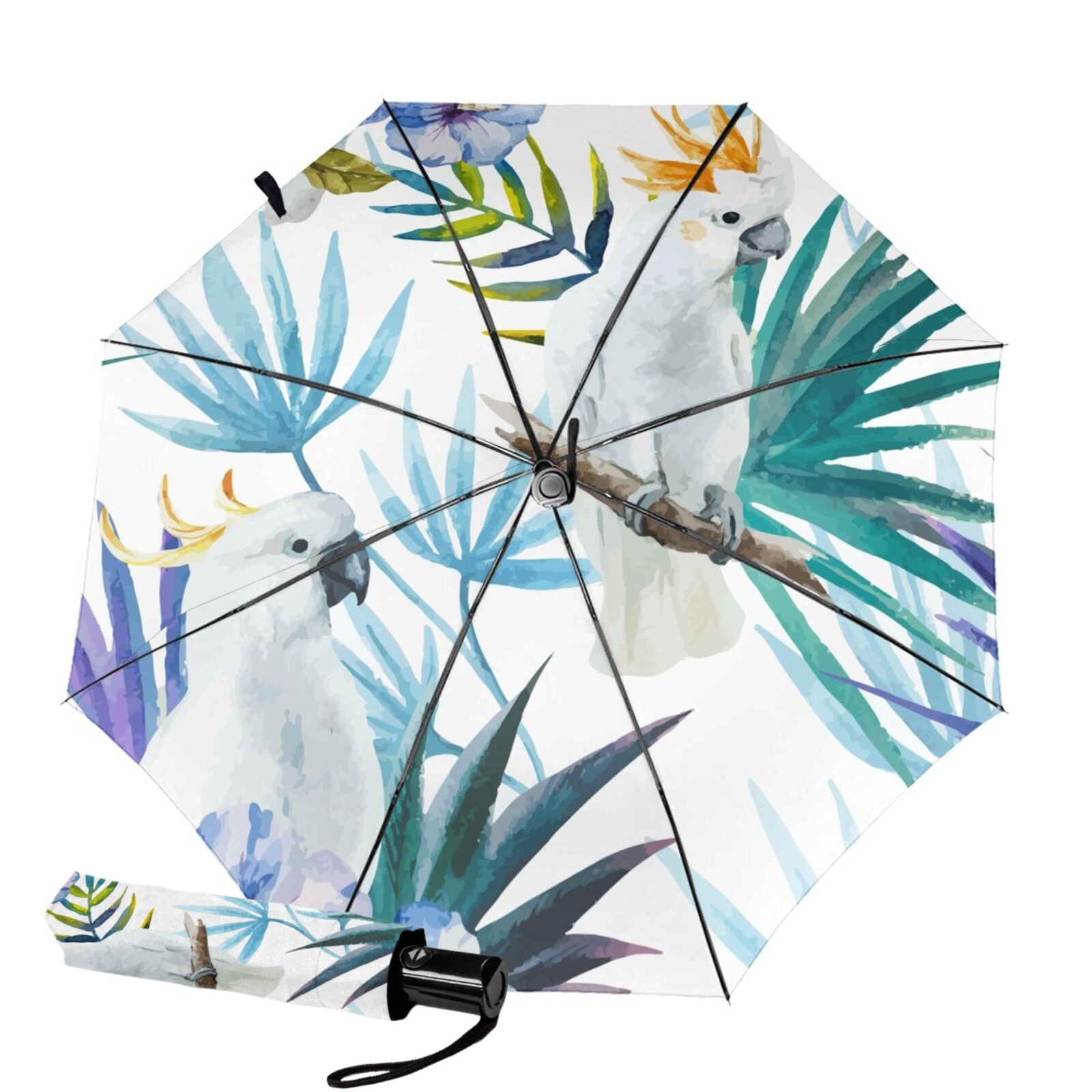 - Dieser bedruckte, faltbare Regenschirm ist auf der Innenseite des Schirmdachs mit einem wunderschönen weißen Papageienmuster bedruckt.