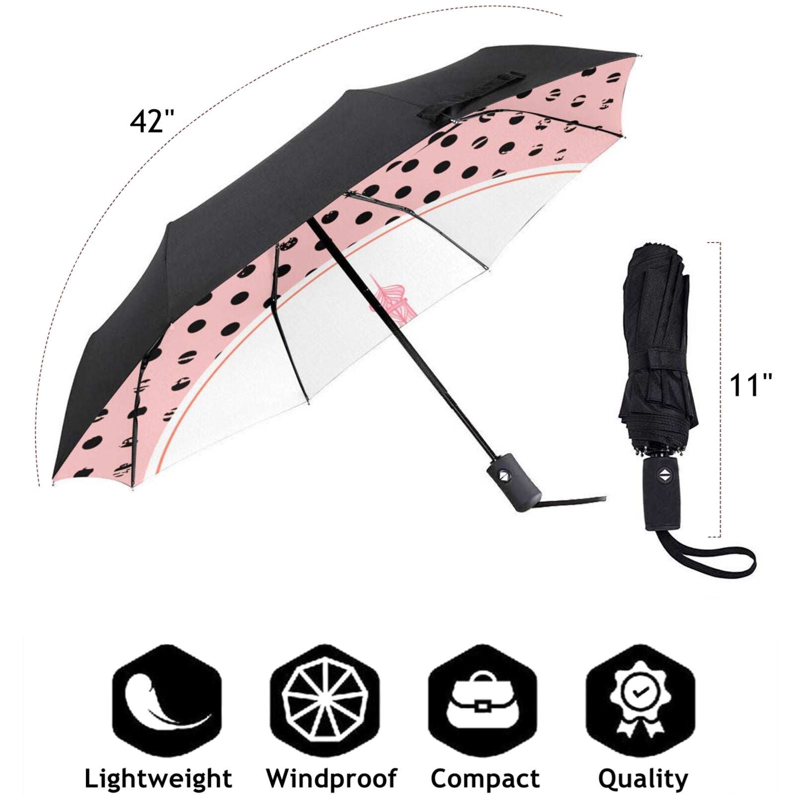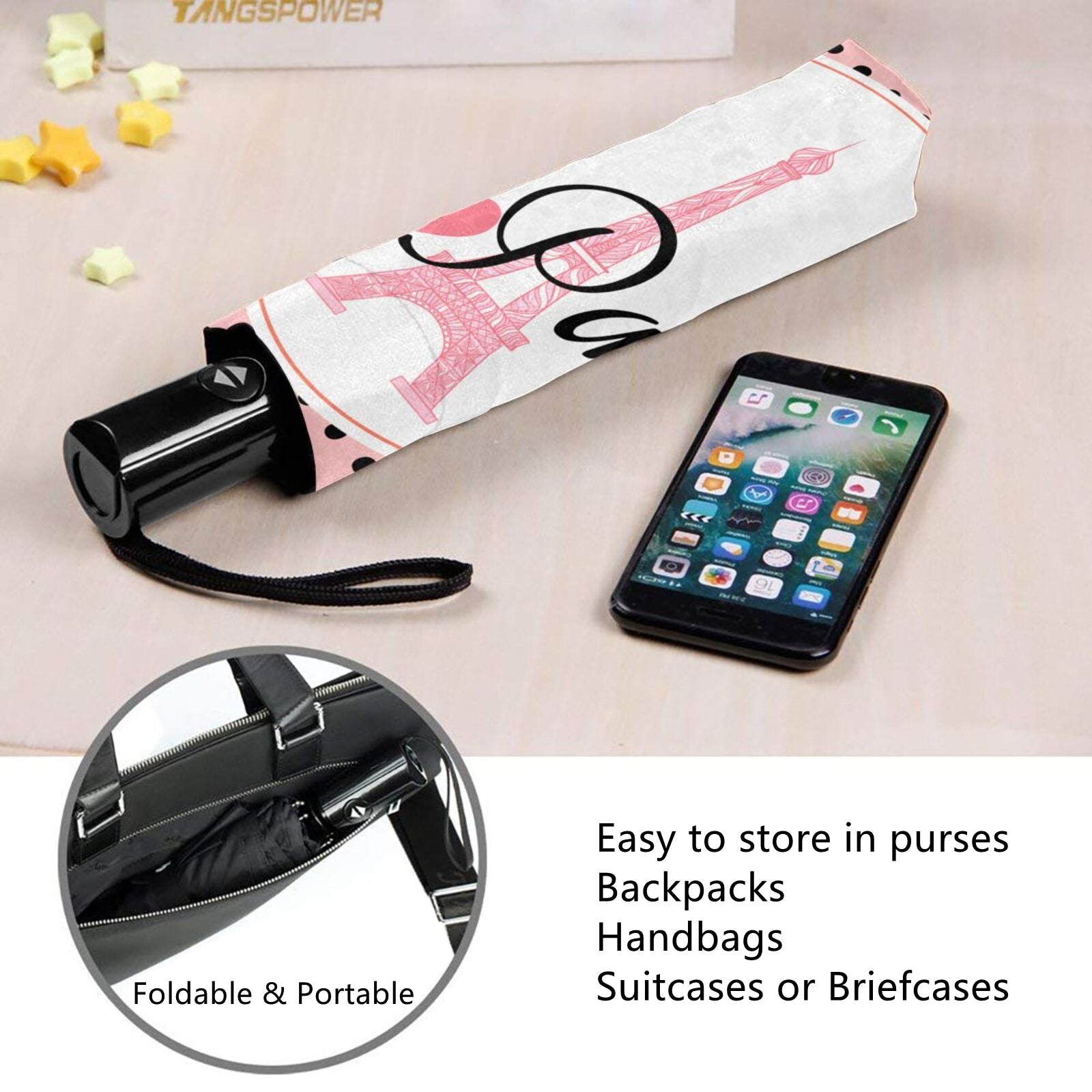 - Die gesamte Aufbewahrungslänge beträgt im zusammengeklappten Zustand des Schirms nur 11 Zoll und das Nettogewicht beträgt nur 350 Gramm. Er passt problemlos in Ihre Handtasche, Ihren Rucksack, Ihre Aktentasche oder die Aufbewahrungsbox im Auto usw.