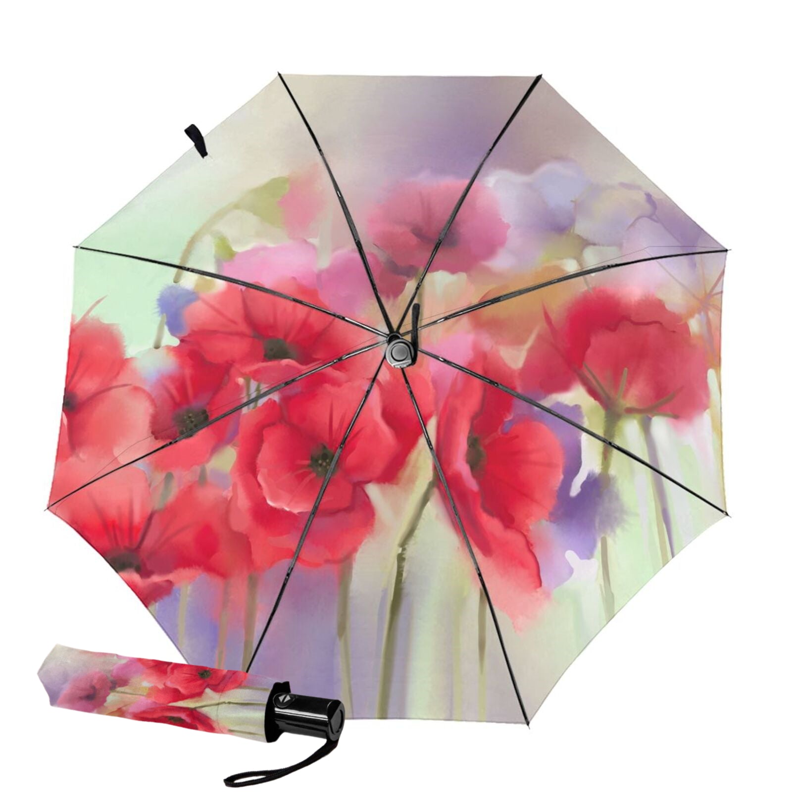 - Dieser bedruckte, faltbare Regenschirm ist auf der Innenseite des Schirmdachs mit einem klassischen roten Blumenmuster bedruckt.
