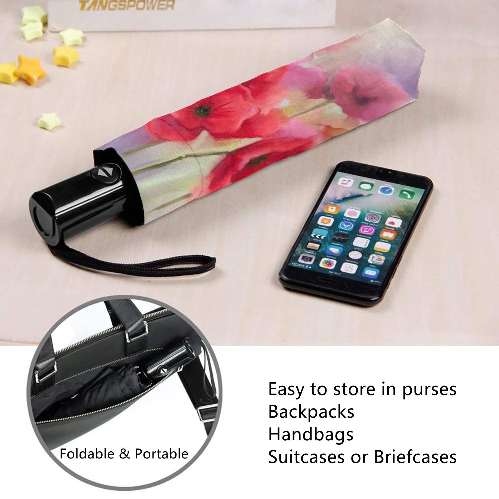 - Die gesamte Aufbewahrungslänge beträgt im zusammengeklappten Zustand des Schirms nur 11 Zoll und das Nettogewicht beträgt nur 350 Gramm. Er passt problemlos in Ihre Handtasche, Ihren Rucksack, Ihre Aktentasche oder die Aufbewahrungsbox im Auto usw.