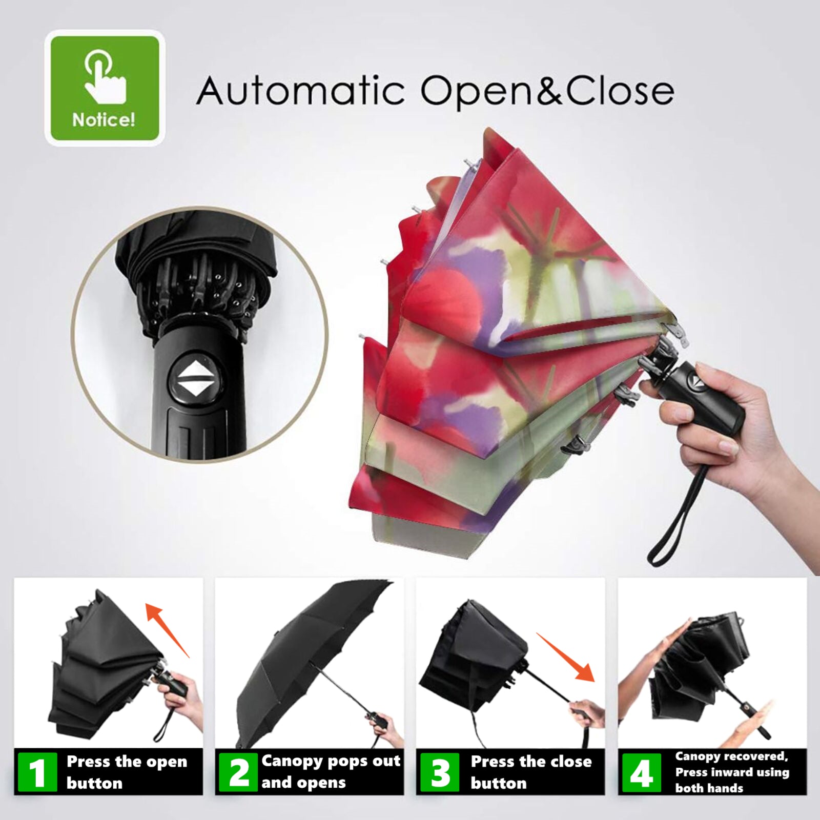 - Dies ist ein superhochwertiger und multifunktionaler Taschenschirm mit automatischem Öffnen und Schließen, der sich sowohl für den Einsatz an sonnigen als auch an regnerischen Tagen eignet.