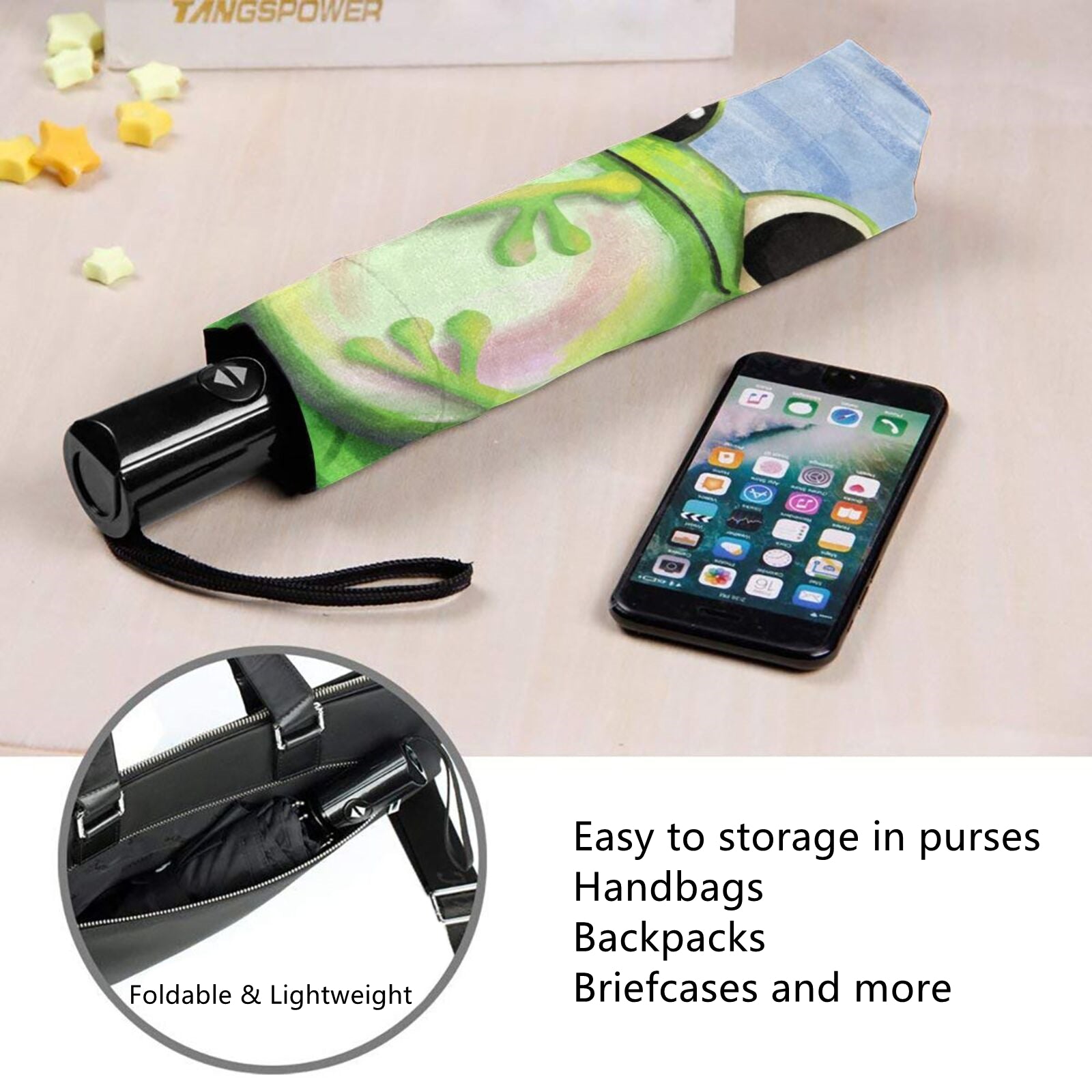 - Die gesamte Aufbewahrungslänge beträgt im zusammengeklappten Zustand des Schirms nur 11 Zoll und das Nettogewicht beträgt nur 350 Gramm. Er passt problemlos in Ihre Handtasche, Ihren Rucksack, Ihre Aktentasche oder die Aufbewahrungsbox im Auto usw.