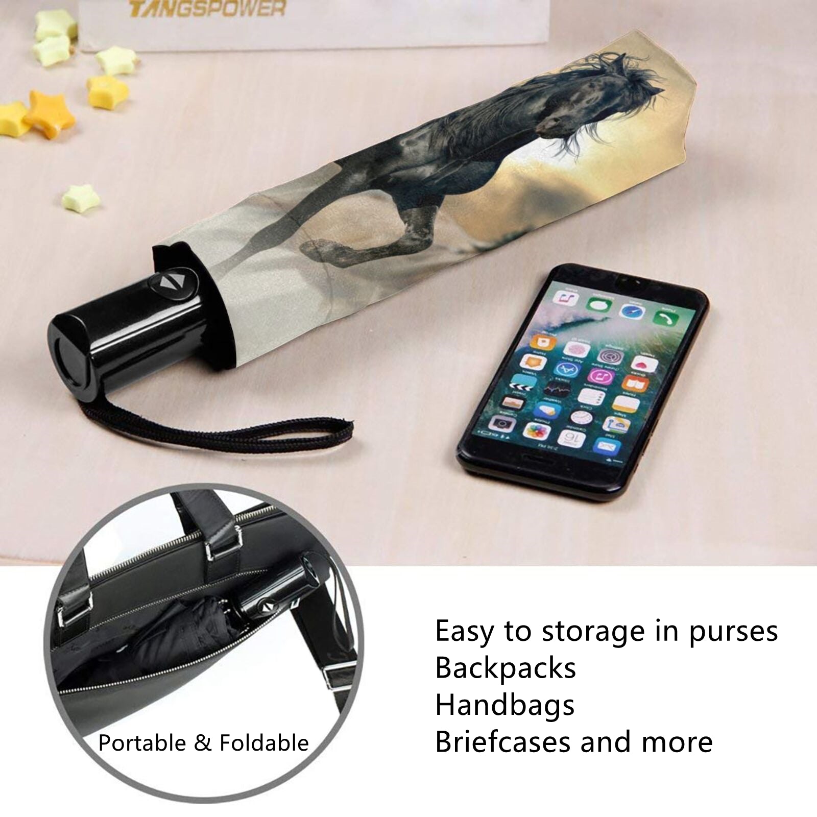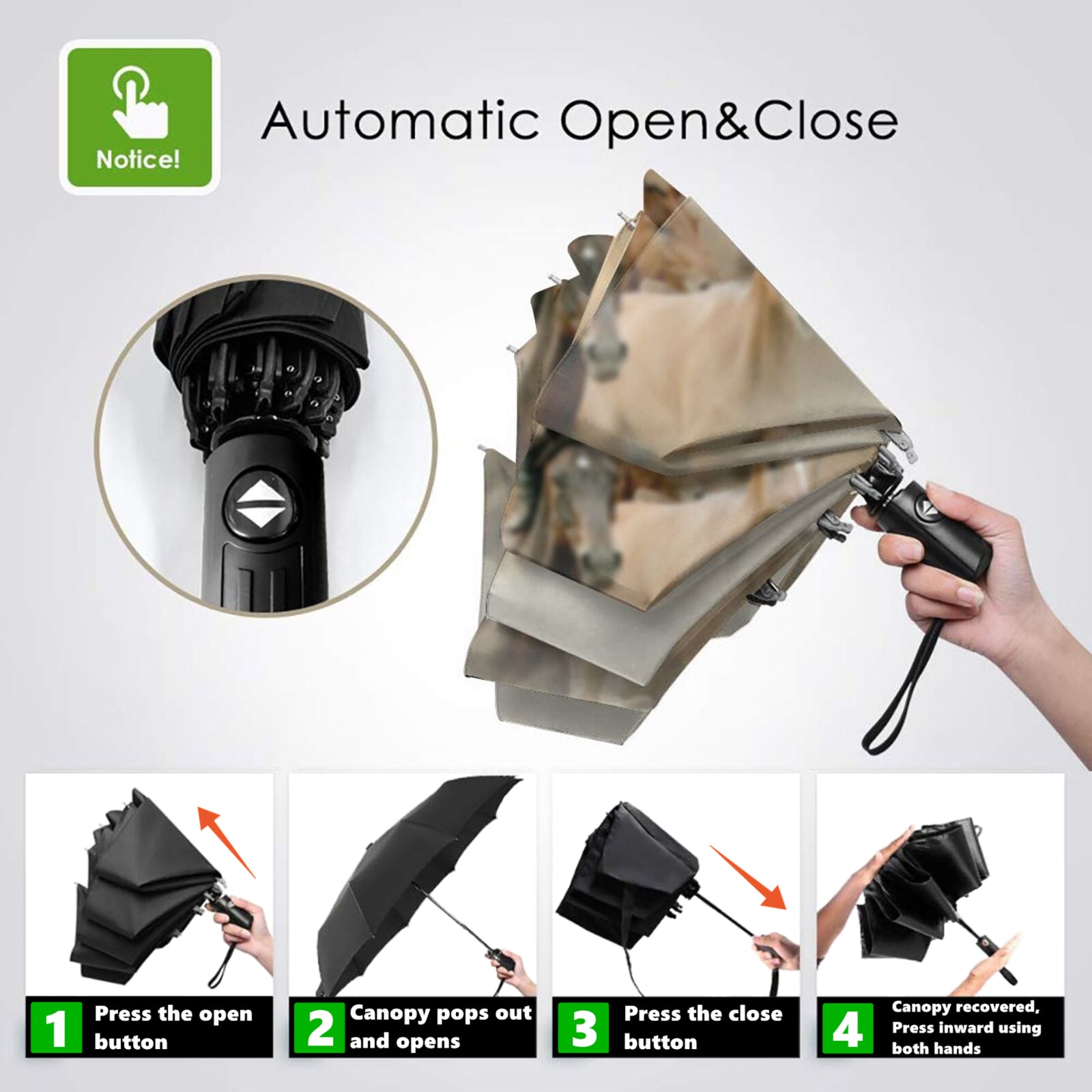 - Dieser bedruckte faltbare Regenschirm ist auf der Innenseite des Schirmdachs mit einem klassischen schwarzen Pferdemuster bedruckt.
