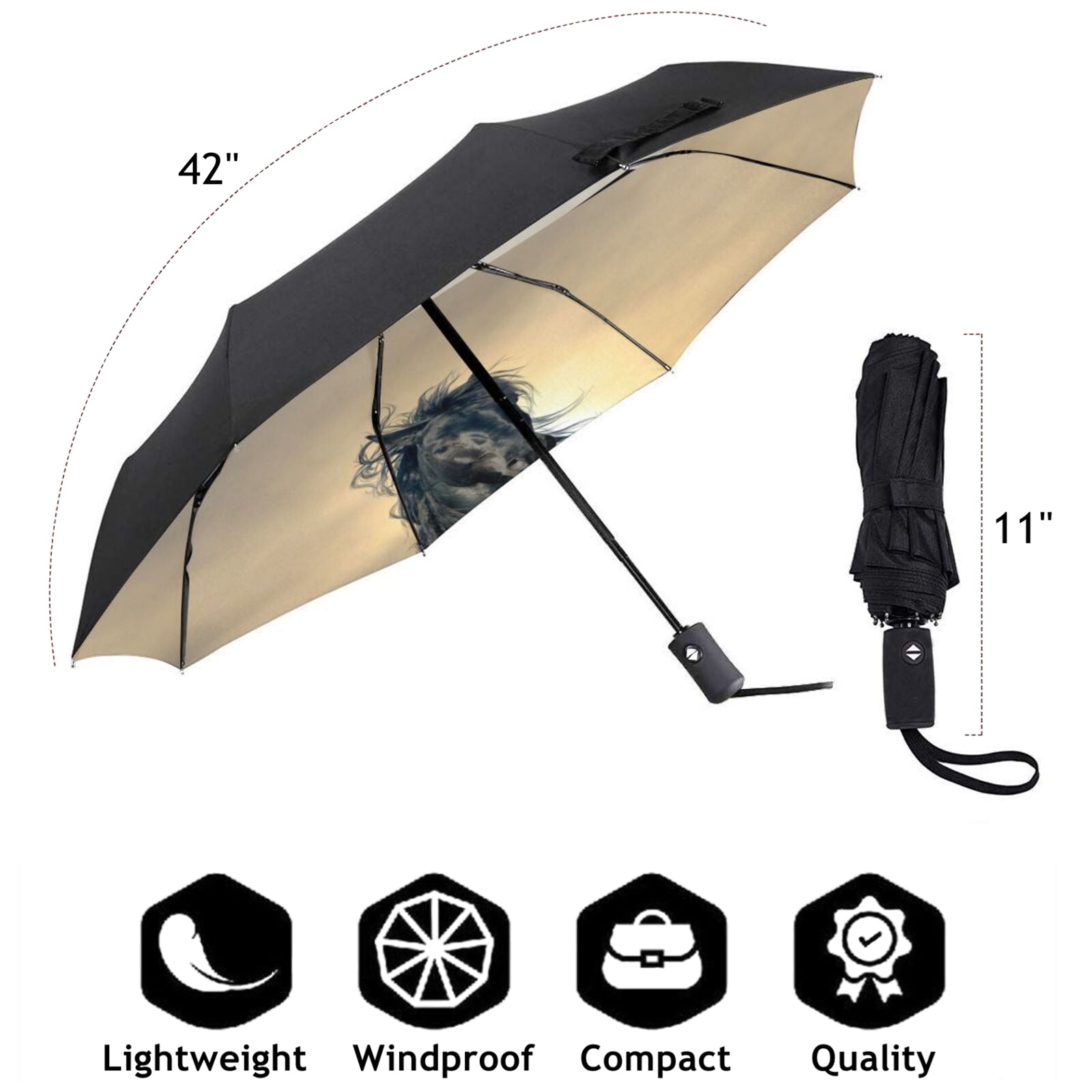 Kleiner Automatik-Regenschirm mit schwarzem Pferde-Print auf der Innenseite