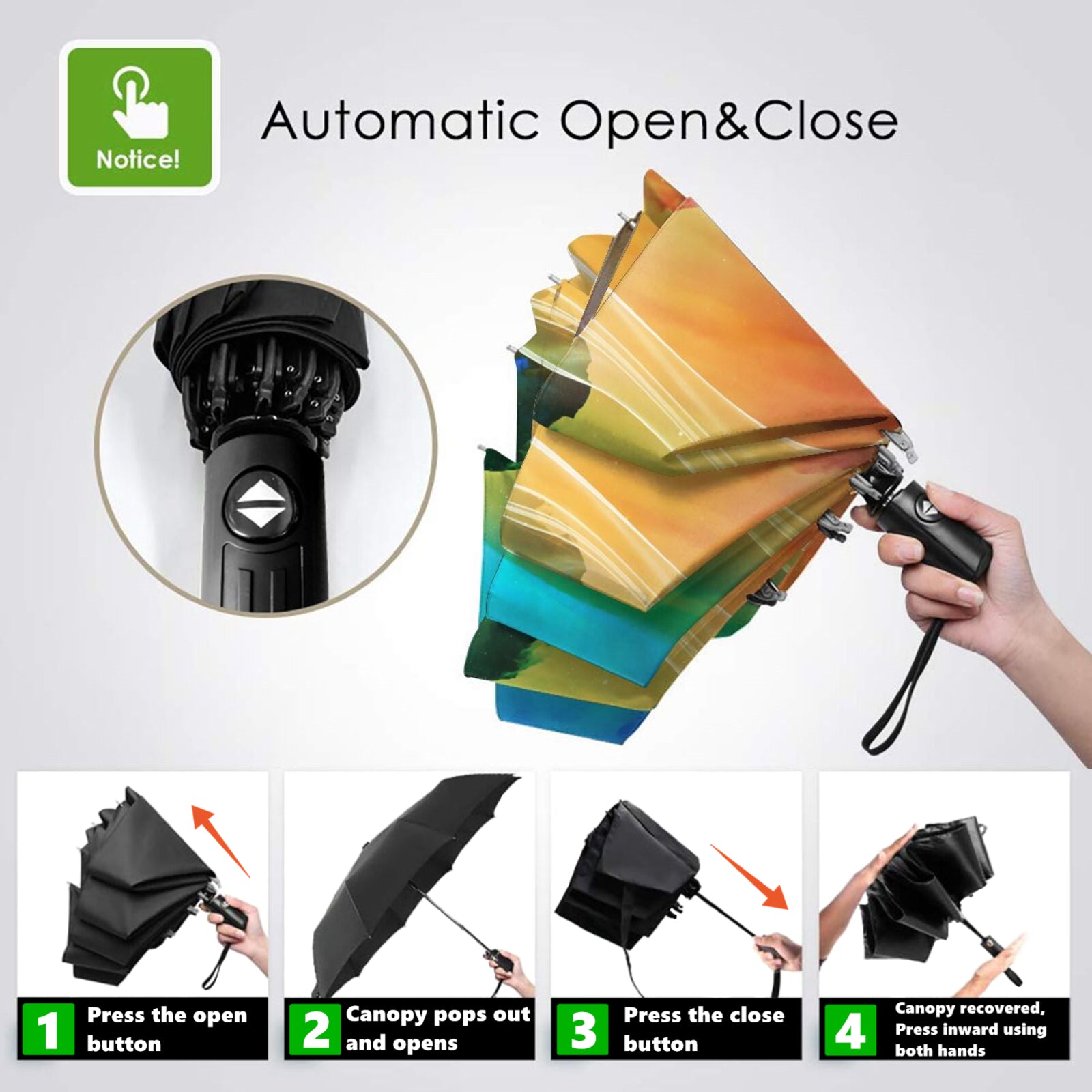 - Dies ist ein superhochwertiger und multifunktionaler Taschenschirm mit automatischem Öffnen und Schließen, der sich sowohl für den Einsatz an sonnigen als auch an regnerischen Tagen eignet.