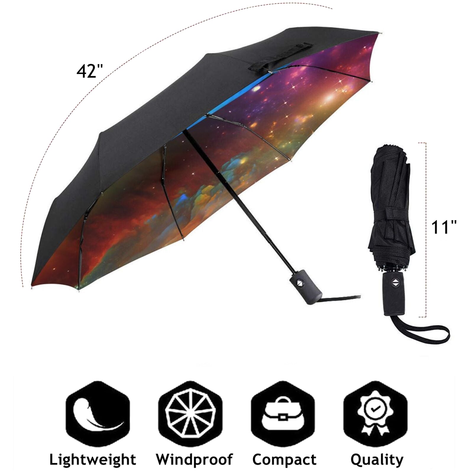 - Dieser bedruckte, faltbare Regenschirm ist auf der Innenseite des Schirmdachs mit einem wunderschönen Sternenhimmel-Muster bedruckt.