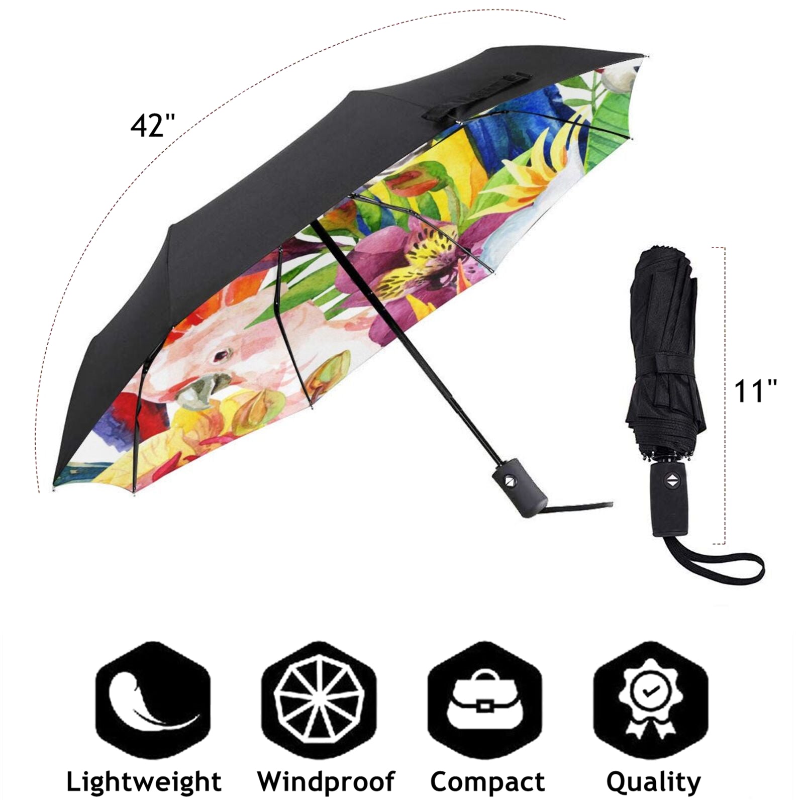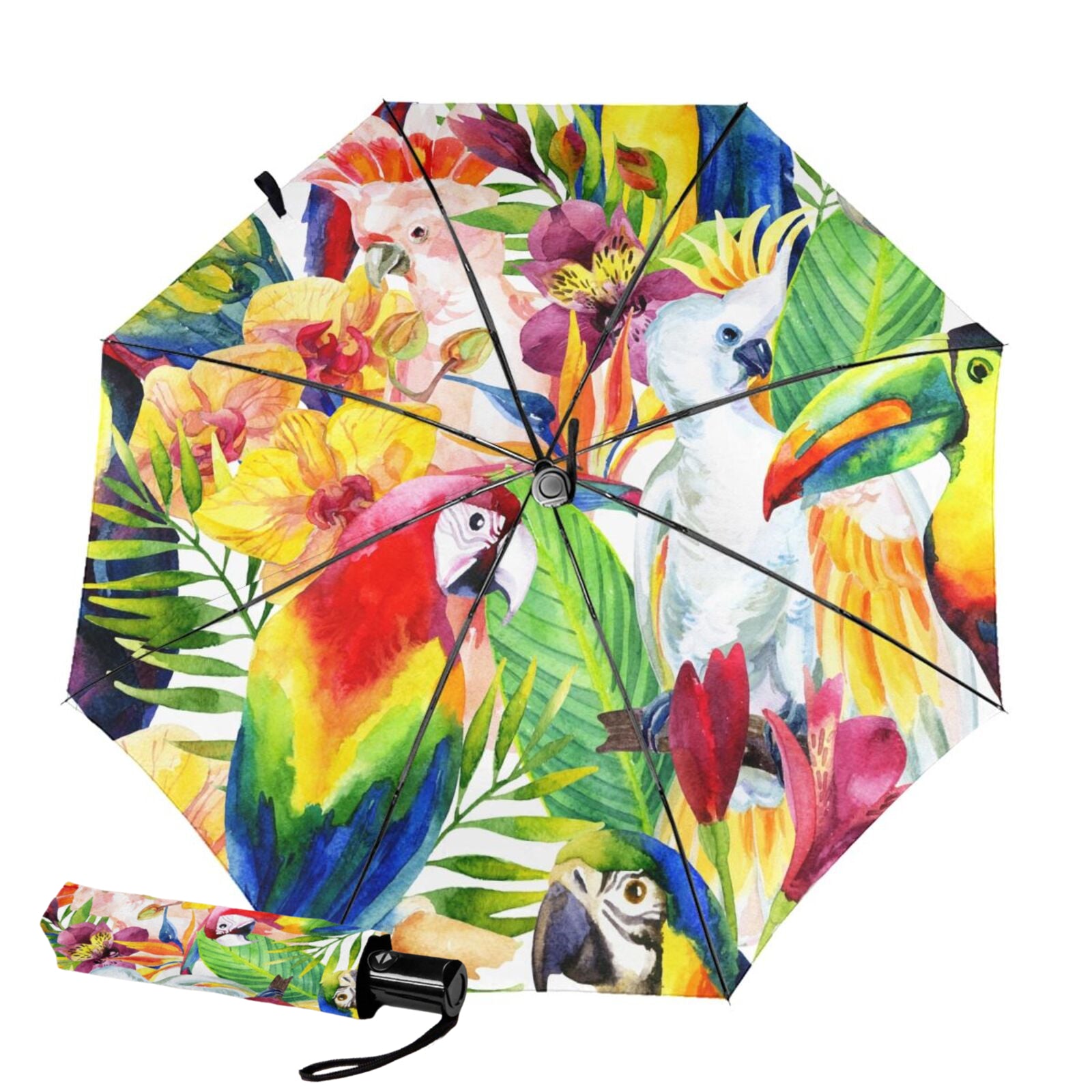- Dieser bedruckte, faltbare Regenschirm ist auf der Innenseite des Schirmdachs mit einem wunderschönen Papageienmuster bedruckt.