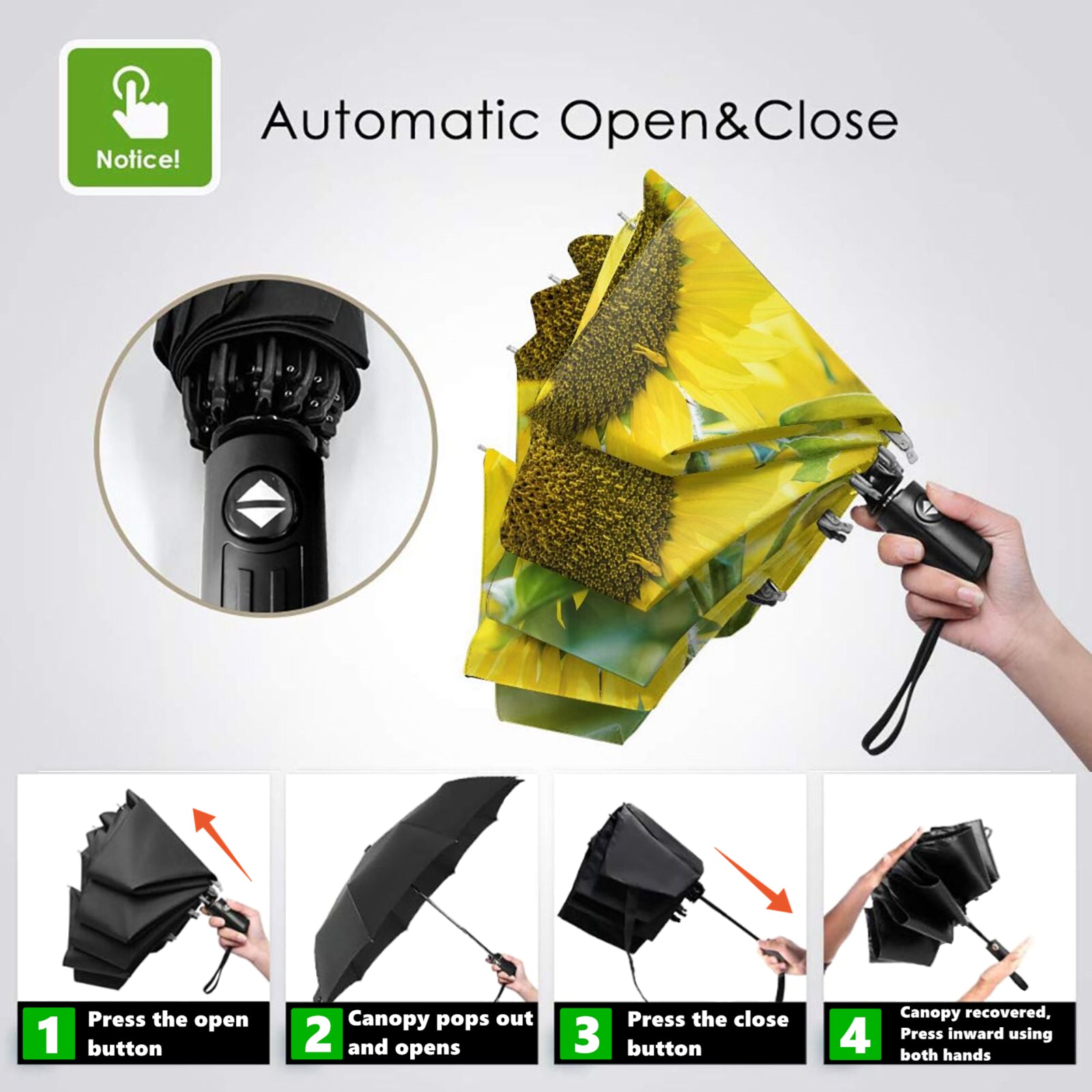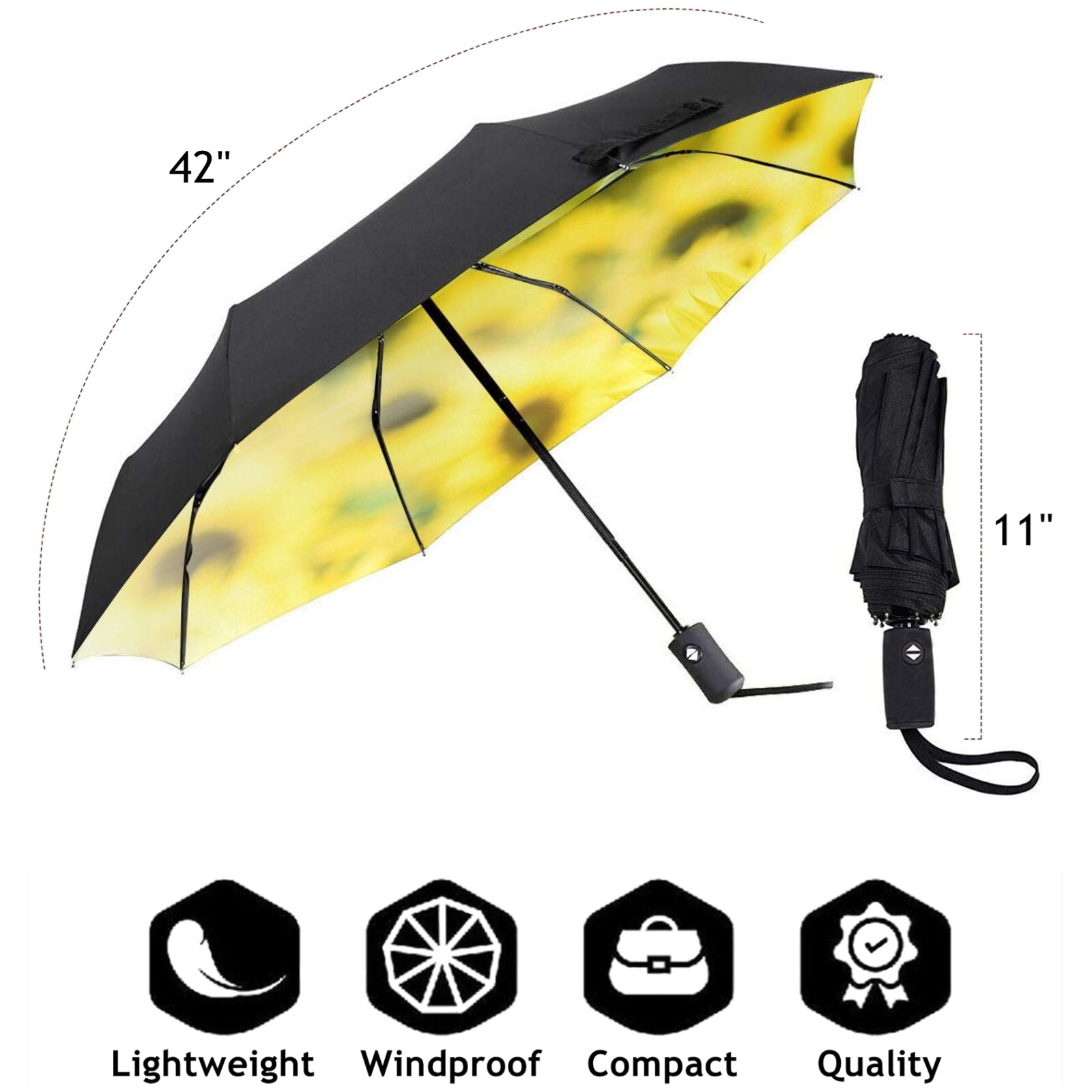 - Dieser bedruckte, faltbare Regenschirm ist auf der Innenseite des Schirmdachs mit einem klassischen Sonnenblumenmuster bedruckt.
