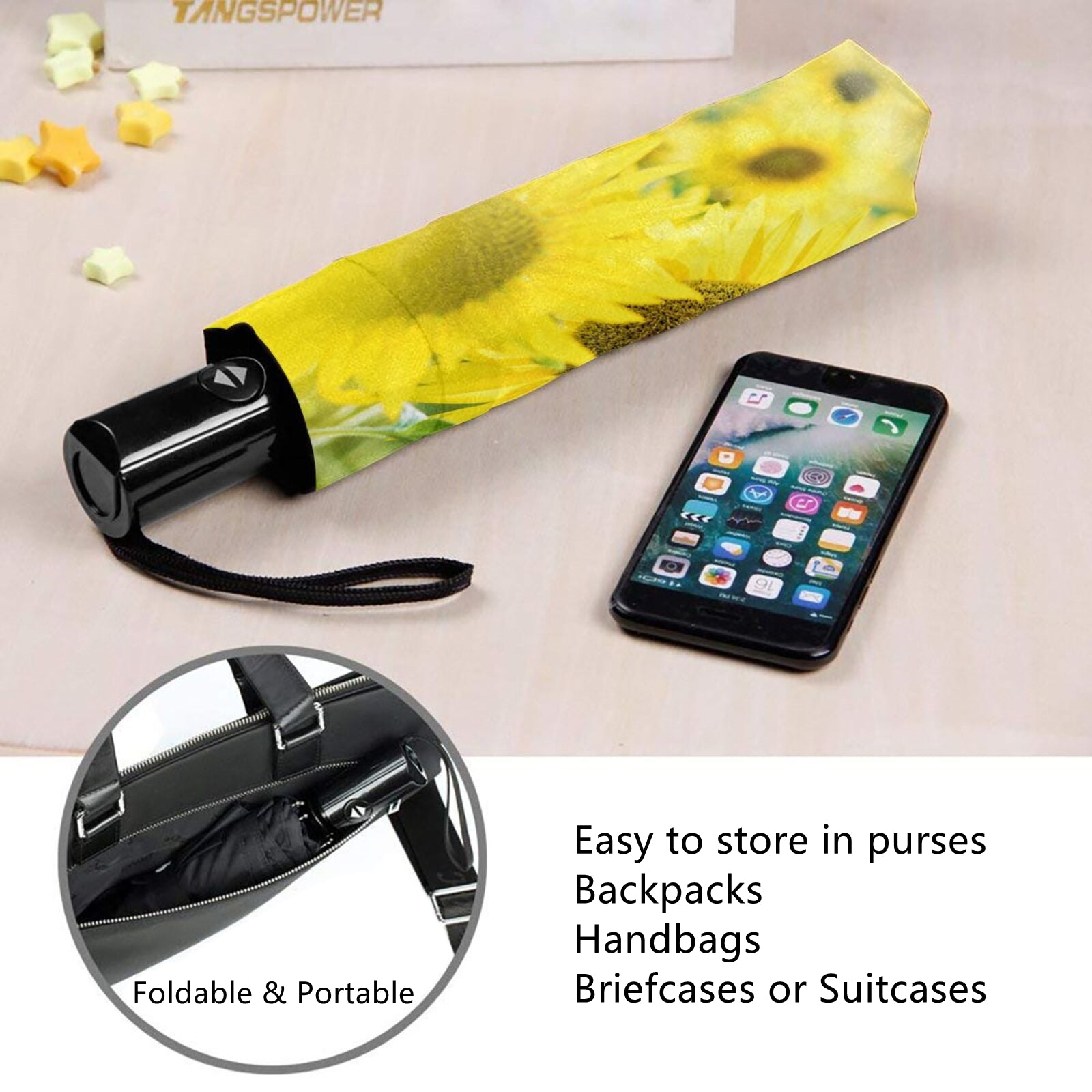 - Die gesamte Aufbewahrungslänge beträgt im zusammengeklappten Zustand des Schirms nur 11 Zoll und das Nettogewicht beträgt nur 350 Gramm. Er passt problemlos in Ihre Handtasche, Ihren Rucksack, Ihre Aktentasche oder die Aufbewahrungsbox im Auto usw.