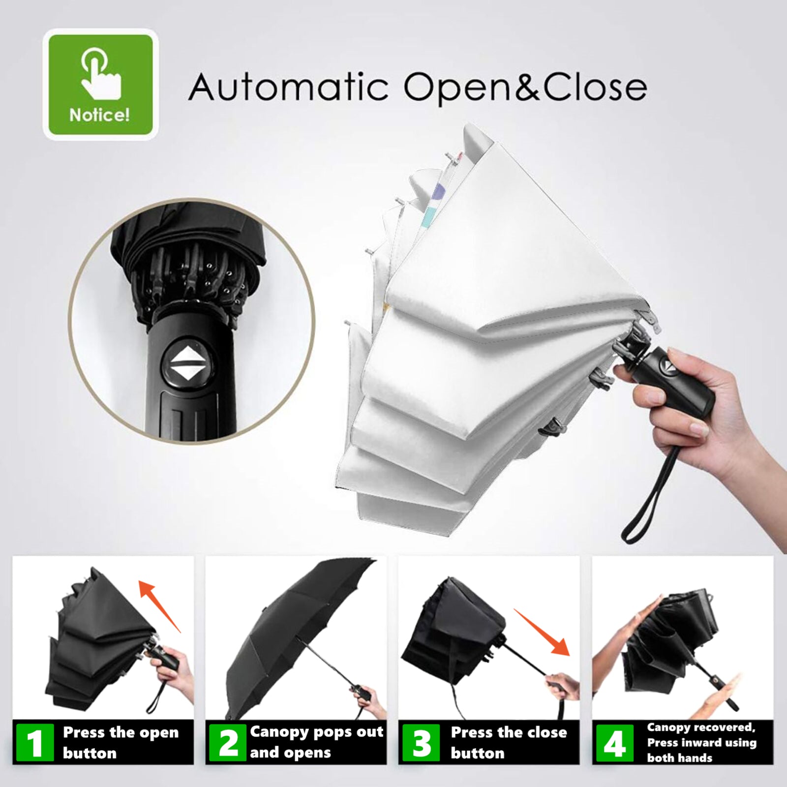 - Il s'agit d'un parapluie pliant automatique multifonctionnel de très haute qualité qui s'ouvre et se ferme automatiquement et qui convient à une utilisation aussi bien par temps ensoleillé que pluvieux.