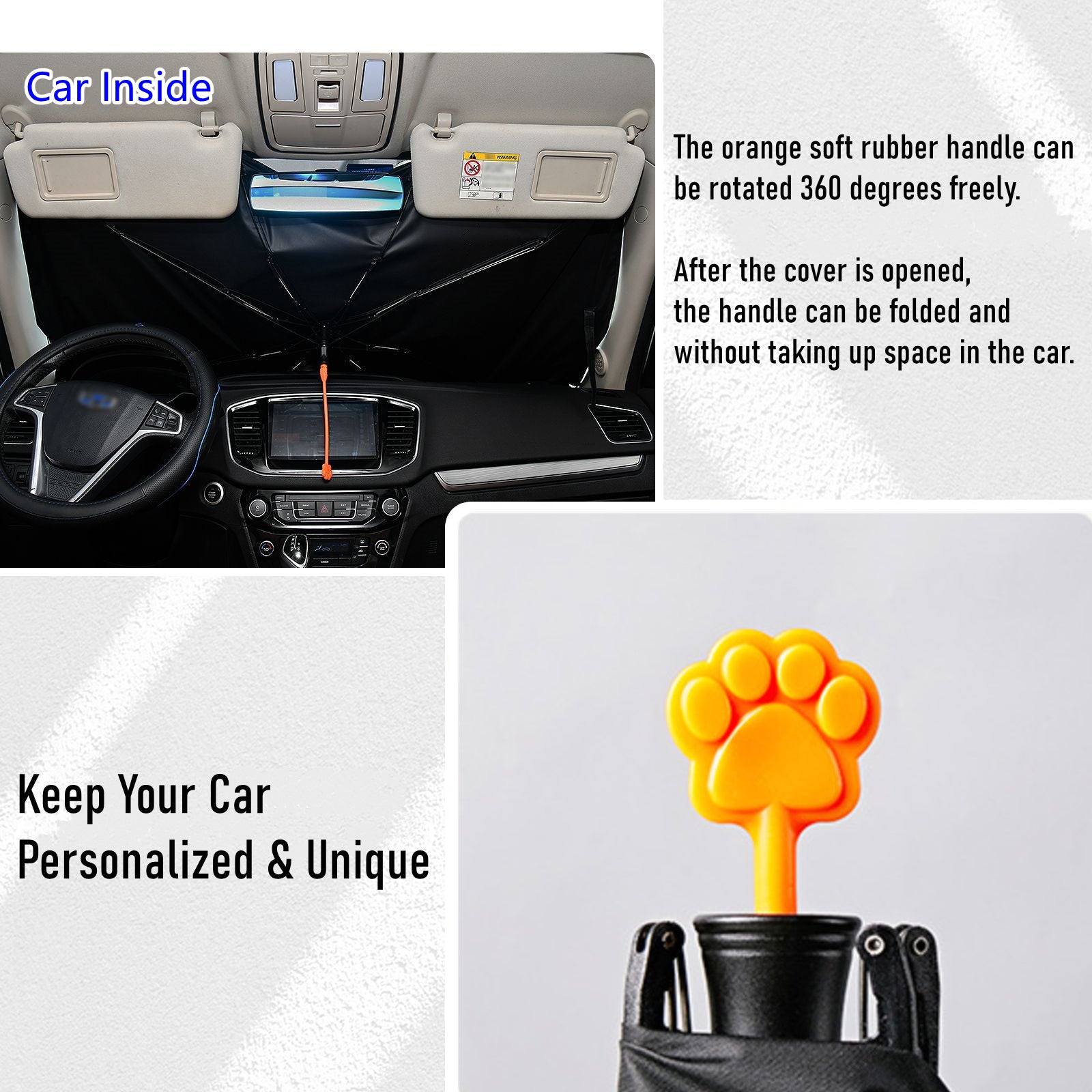 - This windshield umbrella adopt the innovative umbrella-style and features compact, foldable and light in weight, it could be opened and closed like a folding umbrella, very convenient to use; The soft rubber handle with tilt and can be rotated 360 degrees freely; After the cover is opened, the handle can be folded and without taking up space in the car. Matched a black leather pouch, the storage length is just 13 inches and can easily be placed anywhere in the car.