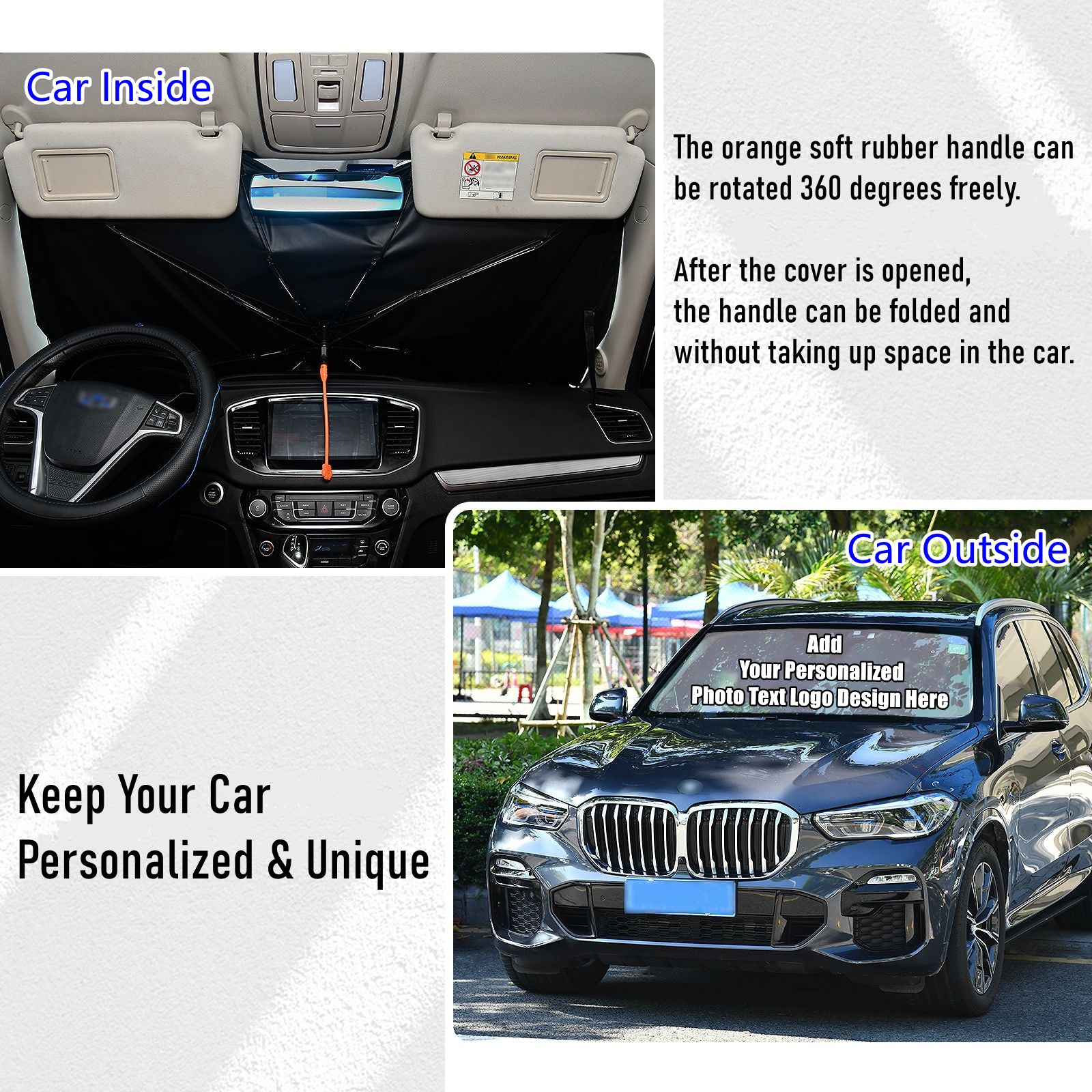 - This is an customizable printing car windshield sun shade umbrella, as photo shows, your own picture, business logo, pattern design, name or text will be customized to print on the FRONT of canopy. Images with 2000x4000 pixels(1:2 Ratio) and above can get better printing results, please kindly be noted.