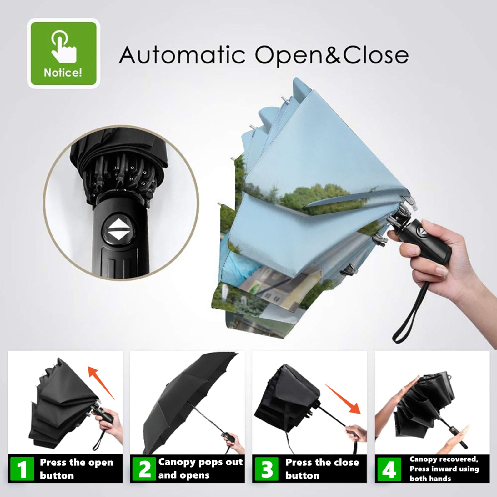 - This is an multipurpose automatic foldable umbrella and features auto open and auto close, compact, windproof, portable, upf 50+ uv protection and excellent waterproof, suitable for sunny and rainy day.