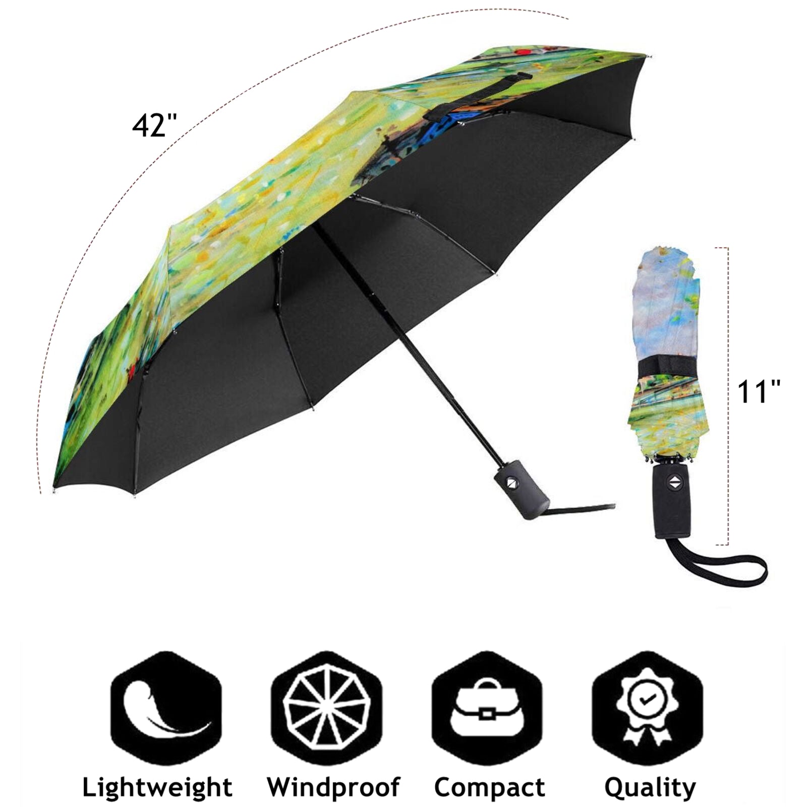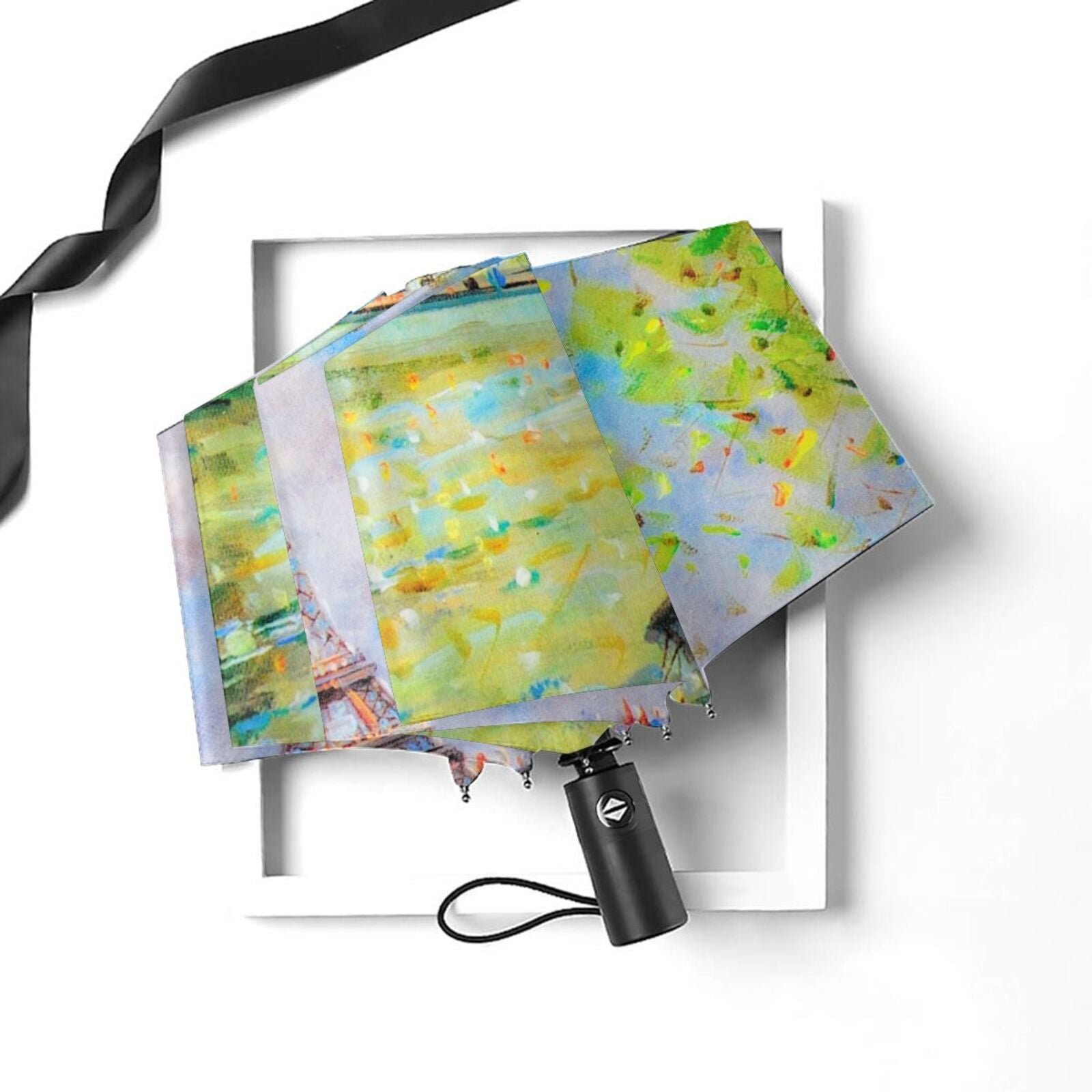- This foldable umbrella is printed with a beautiful paris eiffel tower oil painting pattern design on the outside of canopy.