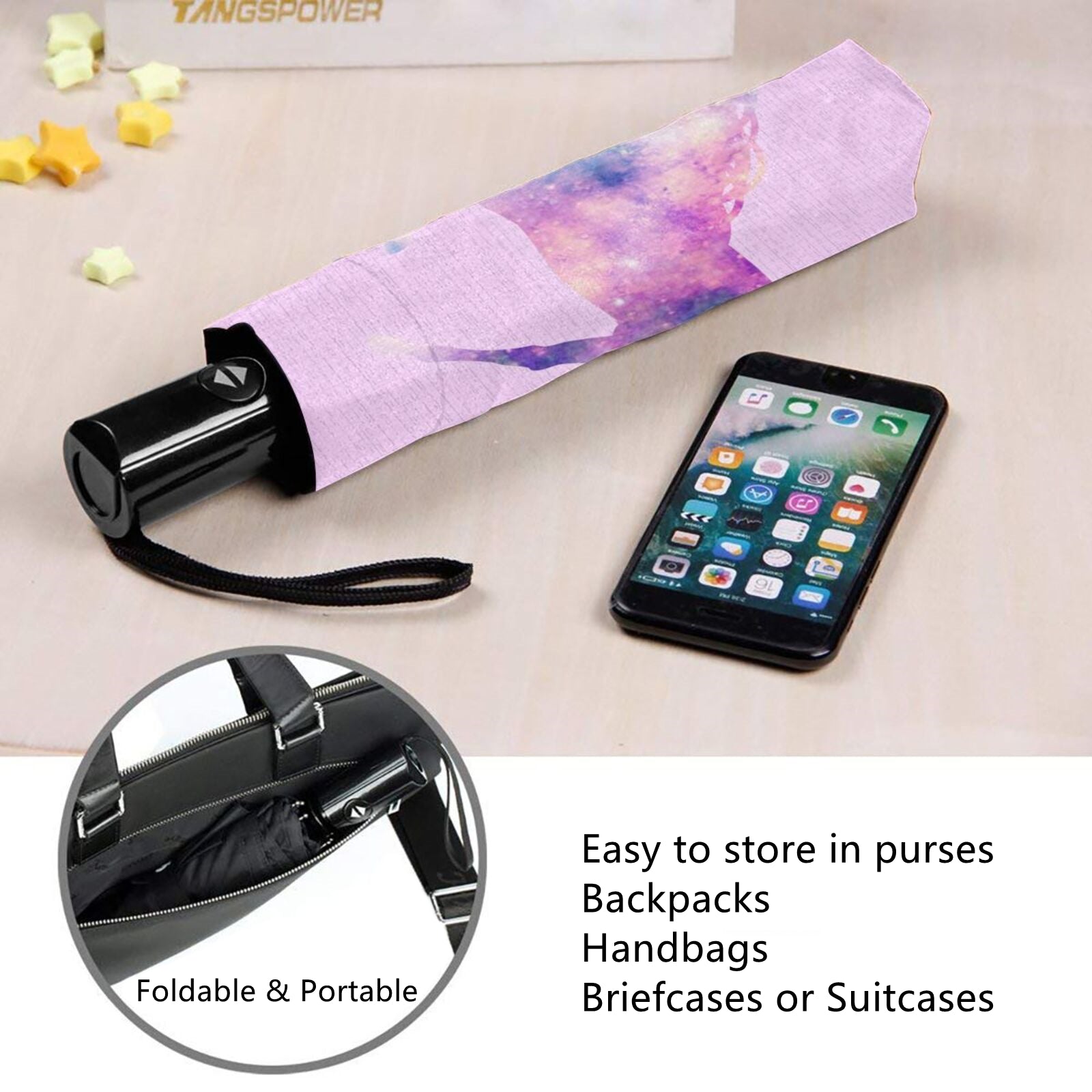 - The total storage length is only 11 inches when the umbrella is folded, and the net weight only 350 grams, fits easily in your handbag, backpack, briefcase or storage box of car, etc.